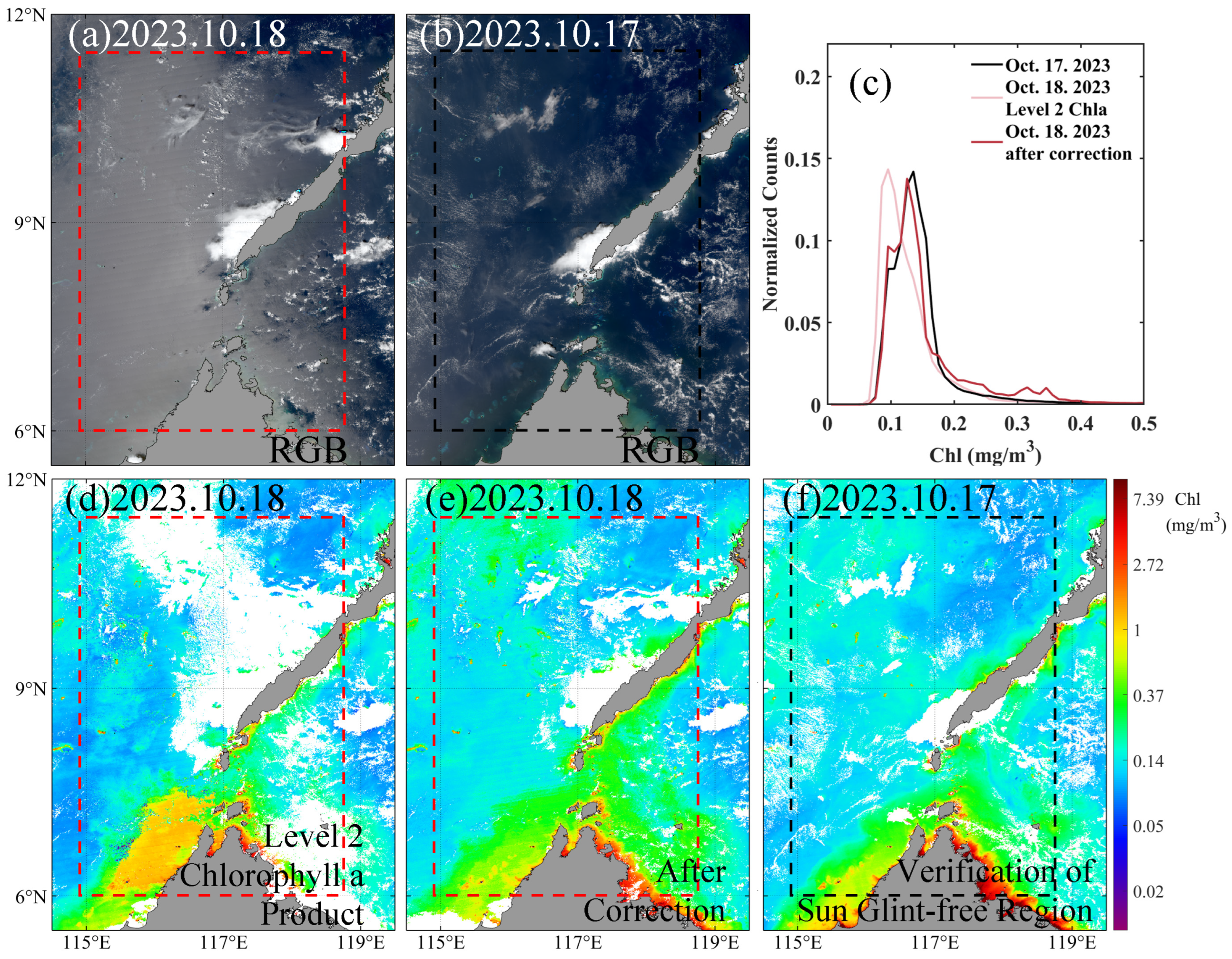 - Chen, J.; He, X.; Liu, Z.; Lin, N.; Xing, Q.; Pan, D. Sun glint correction with an inherent optical properties data processing system. Int. J. Remote Sens. 2021, 42, 617–638. [Google Scholar] [CrossRef]