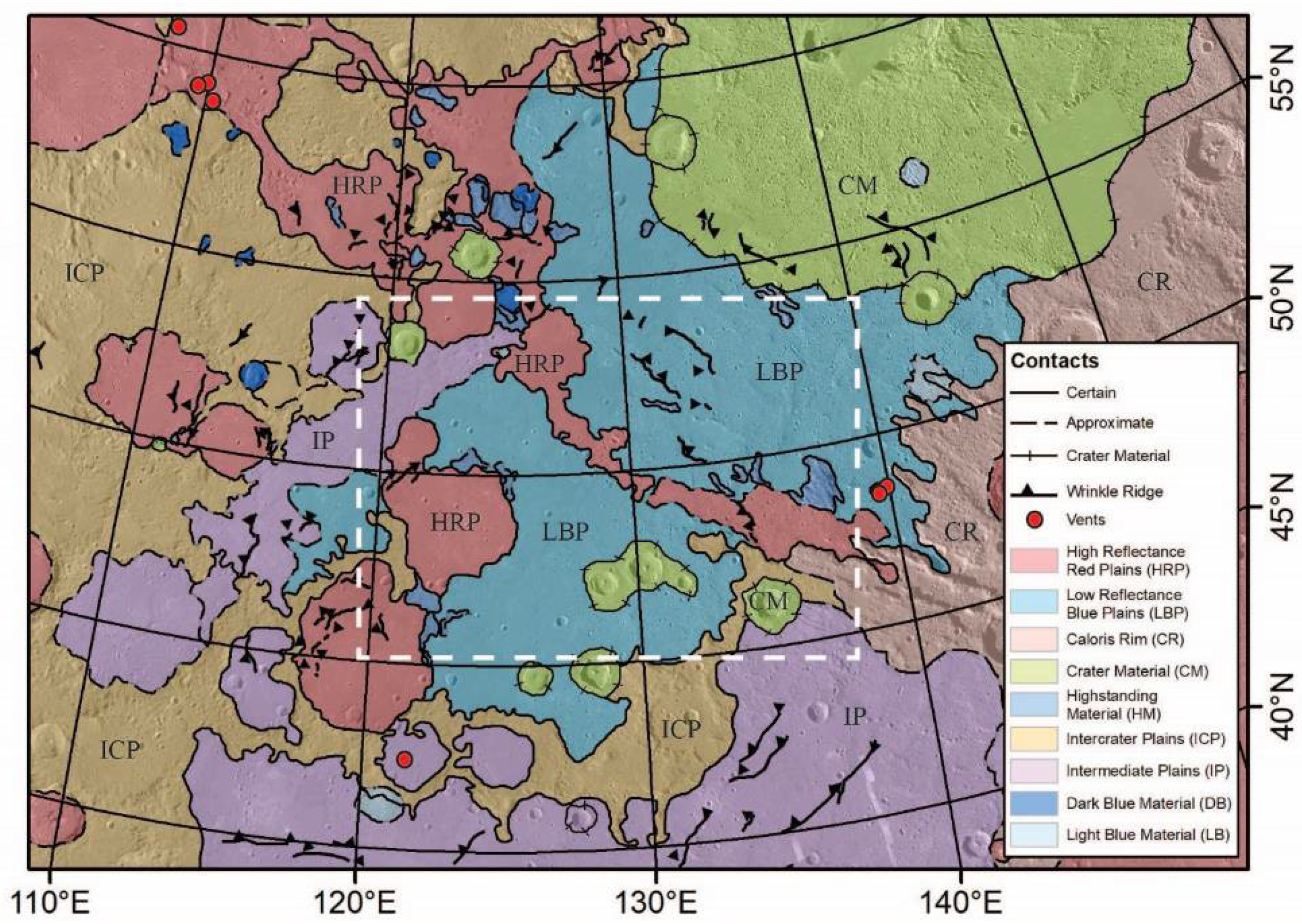 Figure 3. Geomorphological and color-based map of the Caloris exterior plains, mapped at a scale of 1:1M. The HRP and LBP units dominate the region of the basin (see Figure 1 for location context). Dashed white box denotes the extent of Figure 4, the region where crater counts were performed.