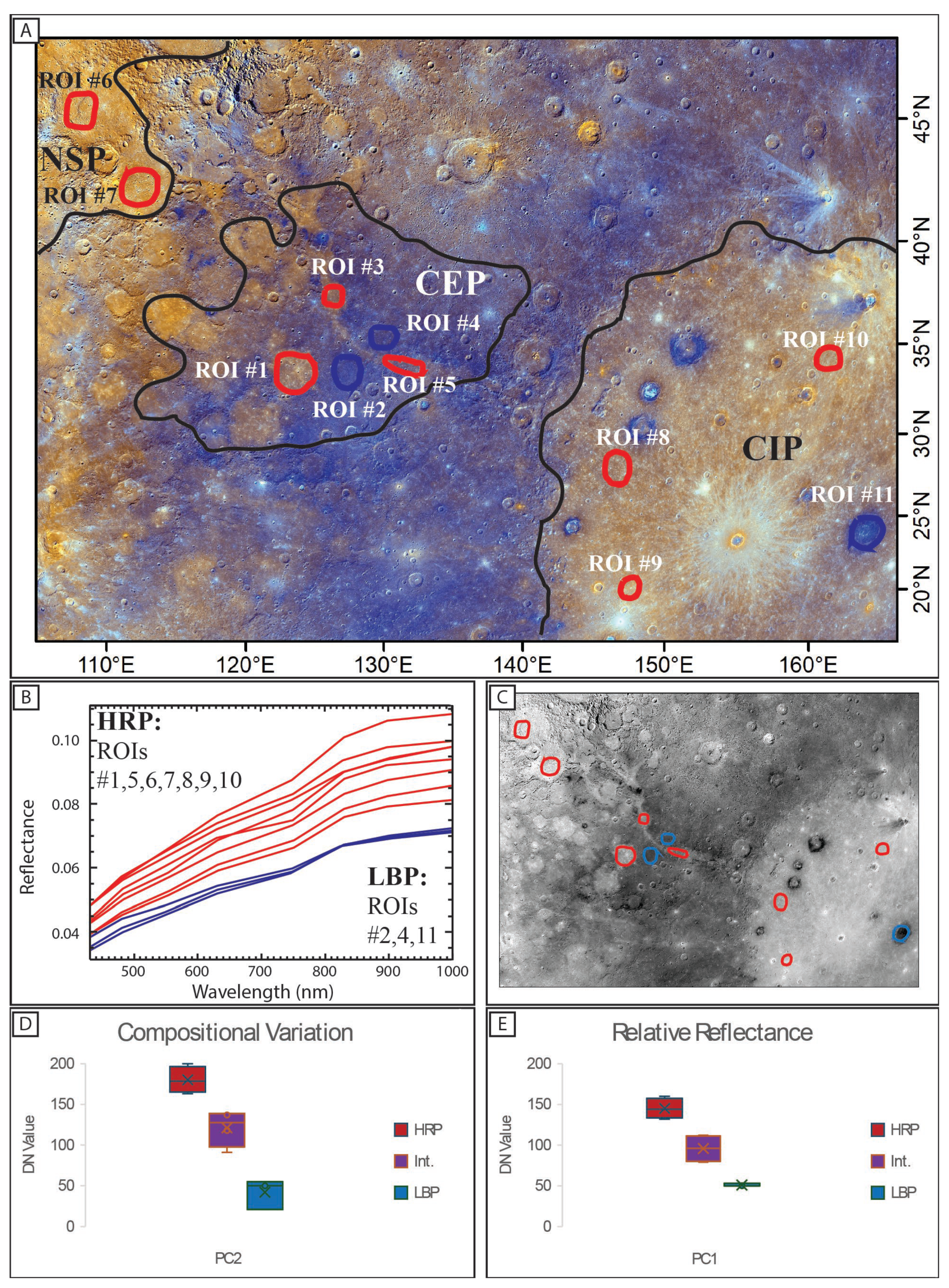 Figure 6. (A) Enhanced color mosaic (R: PC2, G: PC1, B: 430 nm/1000 nm) with overlaid ROIs within the Caloris exterior plains, Caloris interior plains, and northern smooth plains. These ROIs cover HRP (red) and LBP (blue) units in each of the three plains regions marked by black outlines. (B) Spectra of the ROIs. The LBP spectra are tightly clustered while the HRP spectra exhibit a greater spread in spectral slopes. (C) The extracted PC2 from the 3-band enhanced color mosaic, highlighting further differences between HRP and LBP units. The location of ROIs from A are represented by open circles, with red representing the HRP and blue representing the LBP. (D) Box and whisker plot of the PC2 for the ROIs. The PC2 values cluster, corresponding to HRP and LBP units, along with an intermediate unit that combines the spectral characteristics of the two. These data suggest distinct spectral differences between the units based on compositional variation. (E) Box and whisker plot of the PC1 for the ROIs. The clustering of these values suggests differences in relative reflectance which may be related to differing physical characteristics, perhaps related to compositional variation.