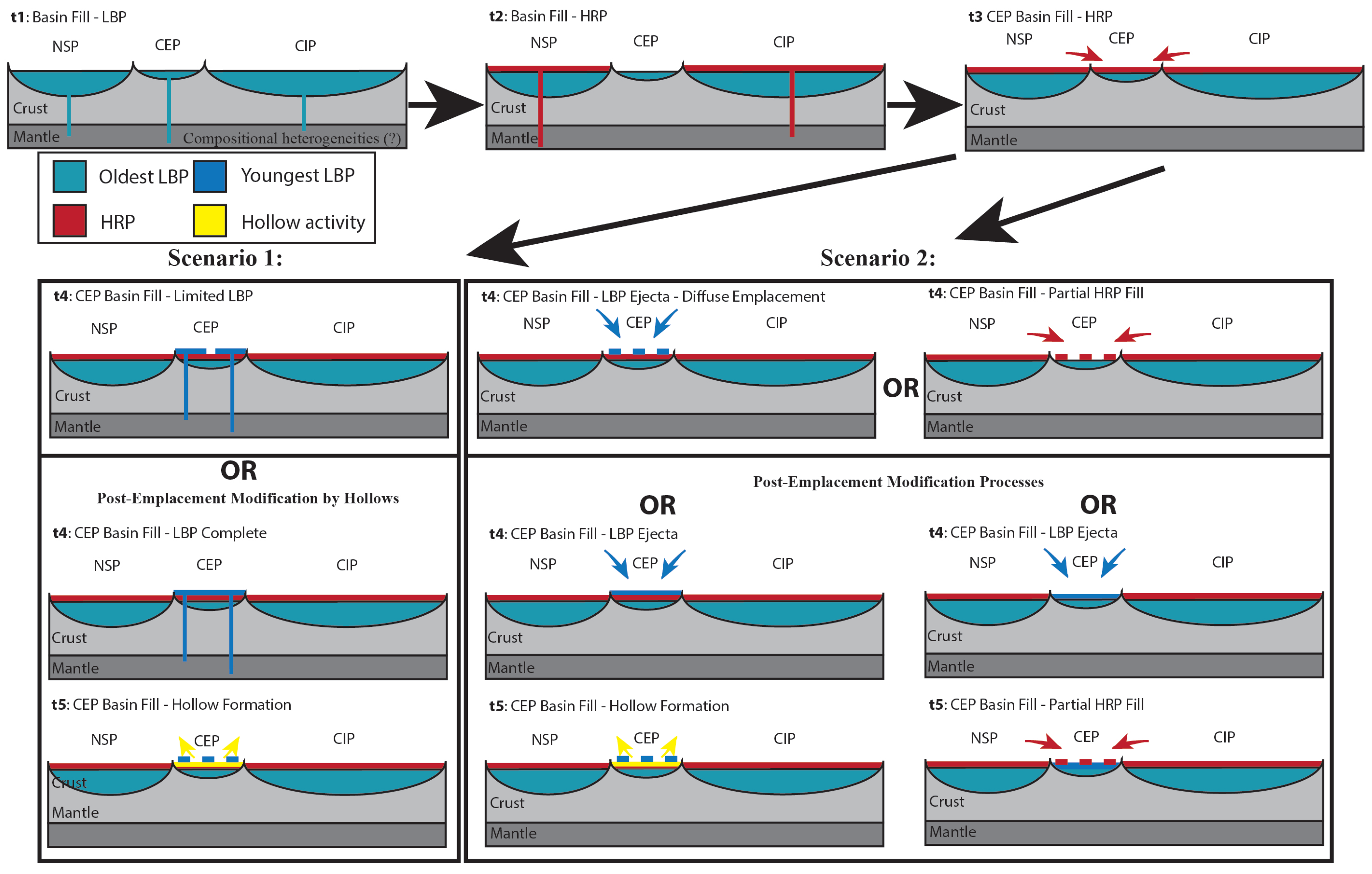 Figure 7. Various scenarios for the emplacement of the Caloris exterior plains, ranging from predominantly volcanic processes (Scenario 1), to primarily ejecta deposits (Scenario 2), and variations in both scenarios that have been modified by post-emplacement processes. The first (t1), second (t2), and third (t3) steps represent common events for both scenarios. Prior to t1, the topographic depressions that comprise the extent of the Caloris exterior plains, Caloris interior plains, and northern smooth plains formed, either from impact or tectonic events. At t1, these depressions were filled with volcanically derived LBP material, likely fed by vertical conduits plumbing melt zones in the mantle. These melt zones may have been compositionally heterogeneous. These initial conduits closed or the magma sources were exhausted by t2, and were replaced by new conduits sampling different locations and compositions in the mantle, which resulted in HRP material filling the Caloris interior plains and northern smooth plains. In Scenario 1, the HRP material then flowed into the Caloris exterior plains during t3, and was subsequently capped by a limited eruption of volcanically derived LBP material in (t4). An alternative for Scenario 1 would involve complete fill of the Caloris exterior plains by the volcanically derived LBP material during t4, which was then dissected (dashed line) by the formation of hollows (yellow). In Scenario 2, several alternatives are presented. The first two options occur at t3, where the LBP was emplaced as diffuse ejecta deposits (dashed blue line) or emplaced as a continuous layer and partially covered by HRP material (dashed red line). If the LBP was once a continuous surface in the Caloris exterior plains, these ejecta-dominated scenarios must have been modified by post-emplacement processes. If the LBP material was originally continuous at t4, it might have been altered by hollow formation of partial HRP flows in the Caloris exterior plains during (t5). Note: The depressions are not to scale and are meant to convey the general size difference between the adjacent terrains and areally limited Caloris exterior plains.