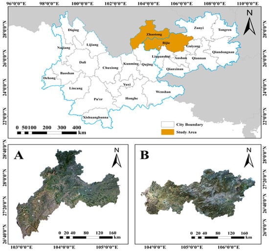 GF-2 satellite imagery of the study areas. (A) Zhaotong region; (B) Bijie region. The images are shown as a composite (R: Band 3, G: Band 2, B: Band 1) with 4 m resolution.
