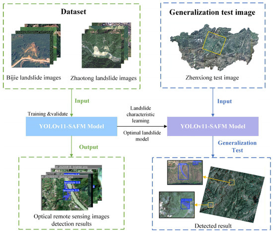 Based on the baseline YOLOv11 architecture, this study develops YOLOv11-SAFM, an efficient detection method tailored for automatic landslide identification in mountainous regions. First, the basic architecture and advantages of the YOLOv11 model are briefly introduced. Subsequently, the model is optimized in three key aspects: (1) The loss function is redesigned to better handle the irregular shapes and uneven spatial distribution of landslides. This improves boundary regression accuracy, reduces missed detections, and enhances the recall rate in dense and small-scale landslide areas. (2) To improve detection under challenging backgrounds, a Spatially Adaptive Feature Modulation (SAFM) mechanism is employed to better capture essential features in landslide imagery with indistinct boundaries. (3) A multi-scale training approach is adopted to enhance the model’s capability in identifying landslides across different scales, particularly improving detection of small-scale targets.