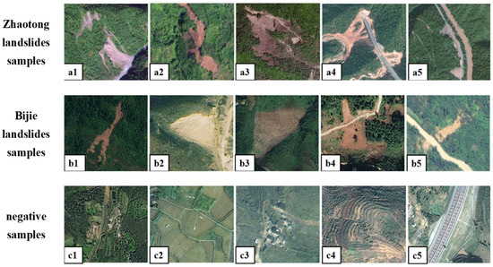 Sample images used in this study. (a1–a5) Landslide samples from Zhaotong, (b1–b5) Landslide samples from Bijie, (c1–c5) Non-landslide background samples.