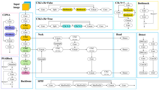 YOLOv11, introduced by Ultralytics in 2024, as a further evolution of the YOLO series, it builds upon the anchor-free architecture and decoupled detection strategy of YOLOv8, introducing modular-level optimizations across multiple layers of the network to improve detection accuracy while maintaining inference efficiency. Its core improvements focus on the feature extraction backbone, integration of attention mechanisms, and the lightweight design of the detection head. An overview of the architecture is provided in Figure 4.