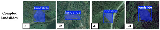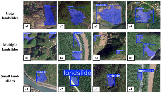 Landslide detection examples using the YOLOv11-SAFM model on the test set. Blue masks indicate landslide boundaries automatically identified by the model. (a1–a4) Examples of large-scale landslides; (b1–b4) Scenarios with multiple co-existing landslides; (c1–c4) Detection results for small-scale landslides; (d1–d4) Landslides partially obscured by vegetation.