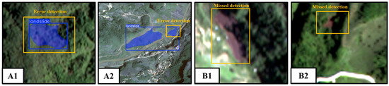 Examples of error detections and missed detections in landslide recognition. (A1,A2) present false positive cases, where (B1) corresponds to erosion landforms and (B2) shows bare soil misidentified as landslides. (B1,B2) illustrate missed detections caused by dense vegetation shadows obscuring key features.