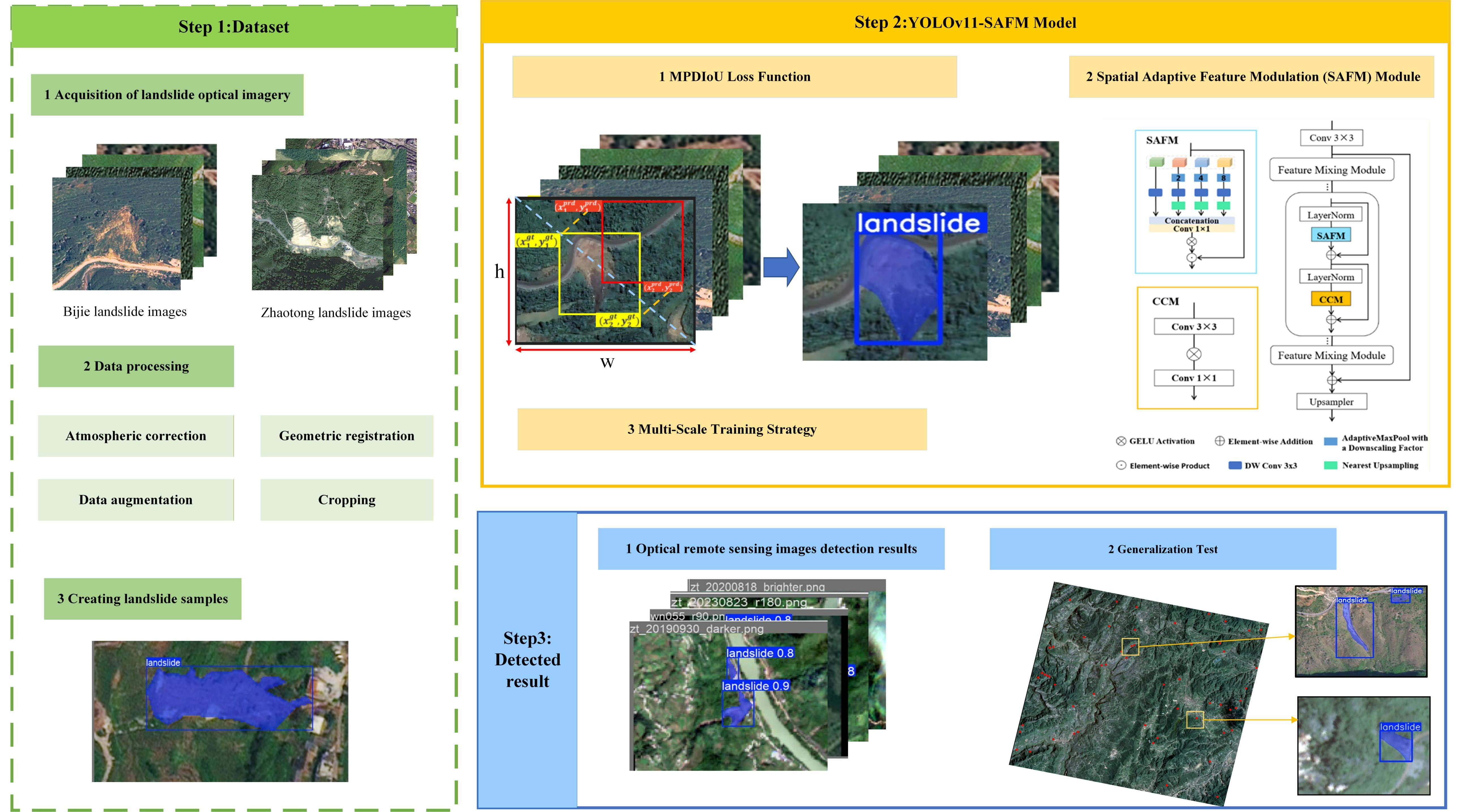 - YOLOv11-SAFM integrates a Spatially Adaptive Feature Modulation (SAFM) module, optimized MPDIoU bounding box regression loss, and a multi-scale training strategy, significantly improving small-scale landslide detection under complex mountainous conditions.