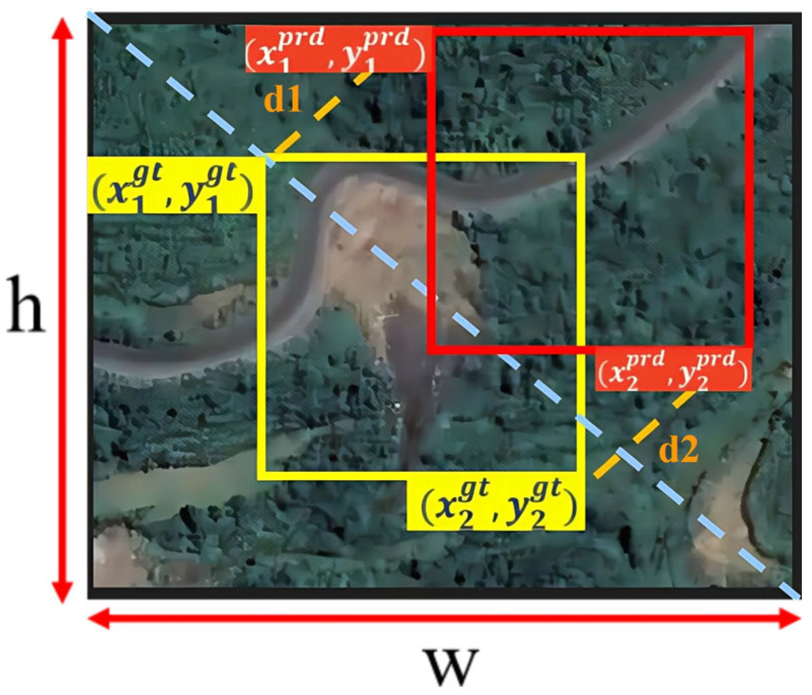 Illustration of the factors, showing the Euclidean distances (d1 and d2) between the predicted and ground-truth bounding boxes. The blue dashed line represents the diagonal scale reference of the predicted bounding box (), which is used to normalize the corner distance terms d1 and d2.