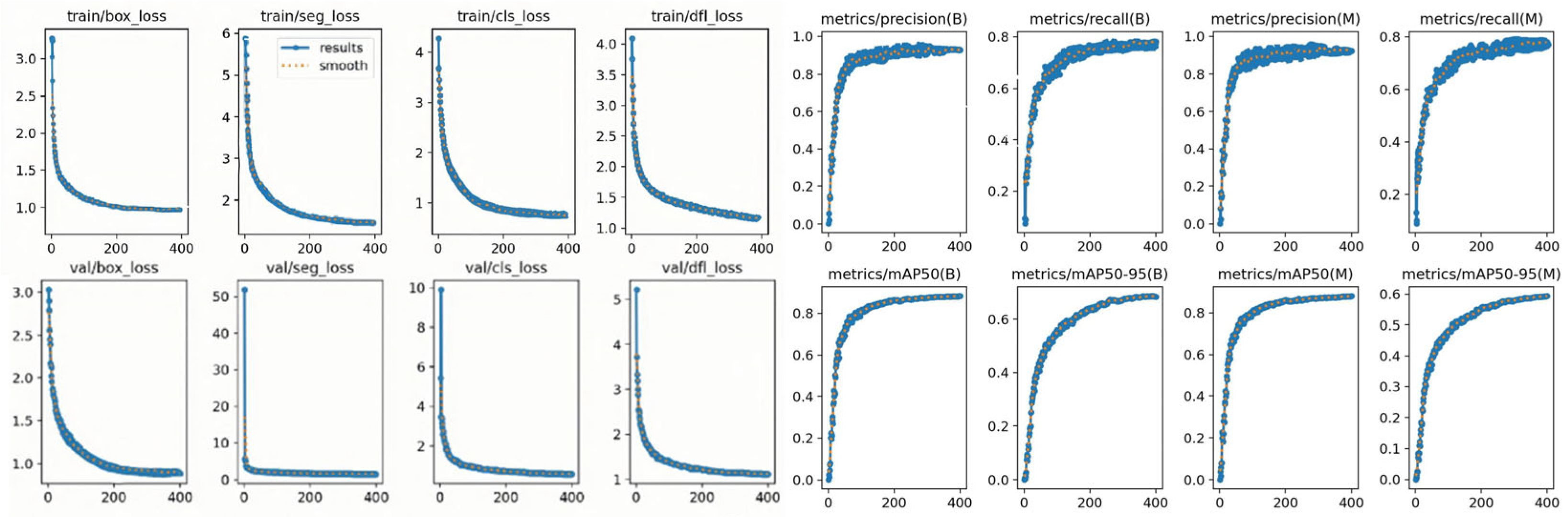 Here, APi denotes the Average Precision for the i class, and N represents the total number of classes in the training dataset (in this study, N = 1). mAP@0.5 is the mean Average Precision over all classes evaluated at an IoU threshold of 0.5. In this study, Mask AP is adopted as the primary metric for evaluating the segmentation accuracy of the YOLO-based instance segmentation model. This metric integrates segmentation precision under varying levels of localization strictness, offering a more thorough evaluation of the model’s detection performance over a range of IoU thresholds.