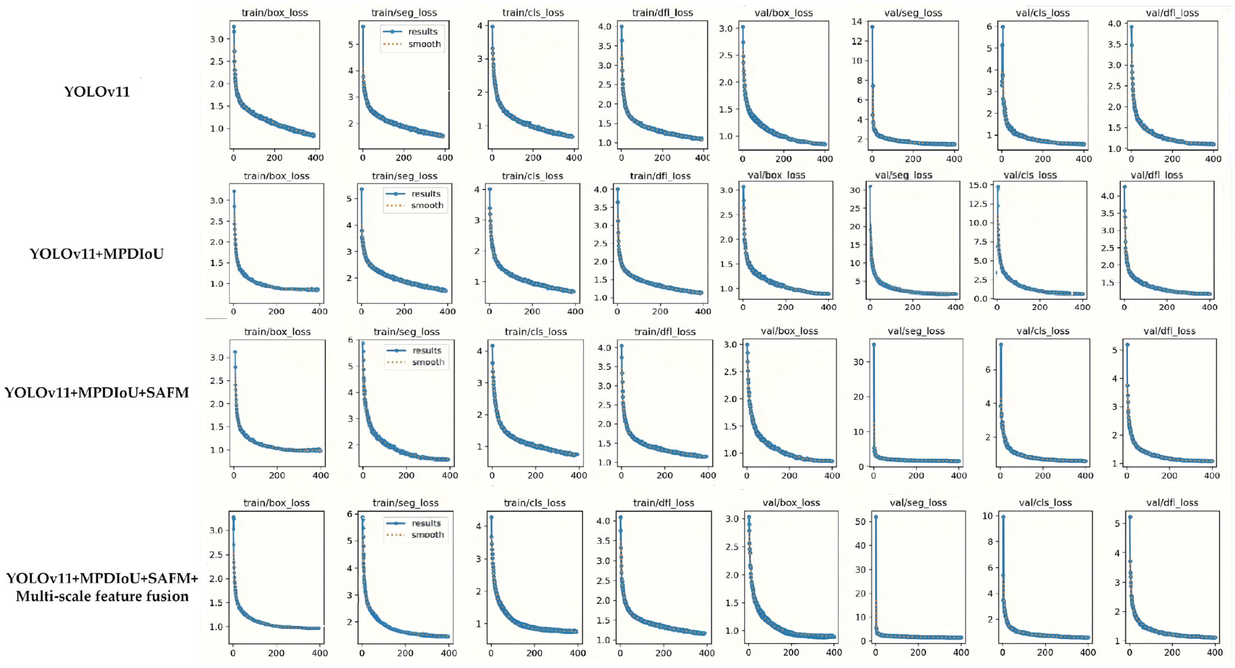 To further investigate the influence of each module on the training dynamics, we compared the training and validation loss curves of the four model configurations, as illustrated in Figure 14. The results show that the MPDIoU loss accelerates the convergence of the regression branch and effectively reduces loss fluctuations during the early stages of training. With the incorporation of the SAFM module, the segmentation loss exhibits a more stable downward trend, indicating that SAFM enhances spatial feature representation and contributes to a more stable optimization process. After integrating the multi-scale feature fusion structure, the overall loss curves become smoother, and the convergence trends of both the training and validation phases become more consistent. Overall, these components not only improve the final detection performance but also positively influence optimization efficiency, convergence stability, and the characteristics of the loss landscape throughout the training process.
