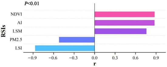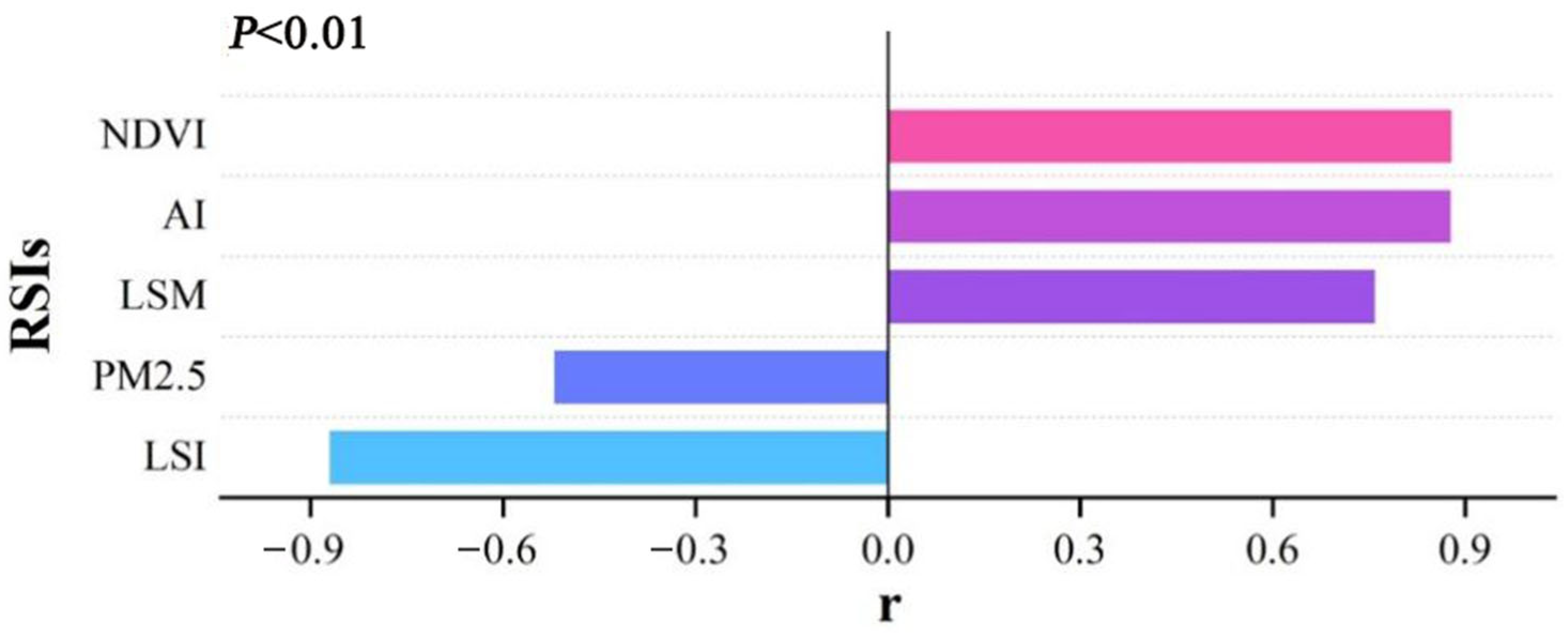 Pearson correlation analysis was performed between the five RSIs and the EEQ to test the impact of each indicator on the EEQ task. Figure 5 shows the correlation coefficients (r). Significant positive correlations occurred between EEQ and NDVI (r of 0.88), AI (r of 0.88), and LSM (r of 0.76), whereas EEQ was significantly and negatively correlated with SEI (r of −0.87) and PM2.5 (r of −0.52). The correlations of these two sets of variables had opposite signs, indicating that they had opposite effects on EEQ, consistent with actual conditions. The result validated that EEQ had a high correlation with five RSIs (p < 0.01), indicating that the five indicators were appropriate for evaluating EEQ.