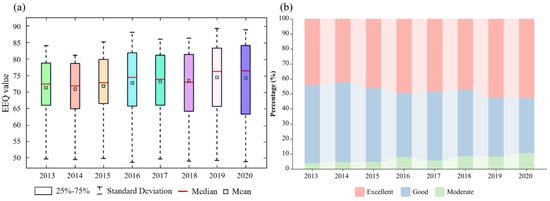 Statistical results of (a) boxplot of the EEQ values and (b) area distribution of EEQ levels in Guangzhou from 2013 to 2019.