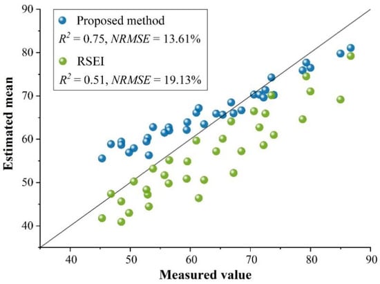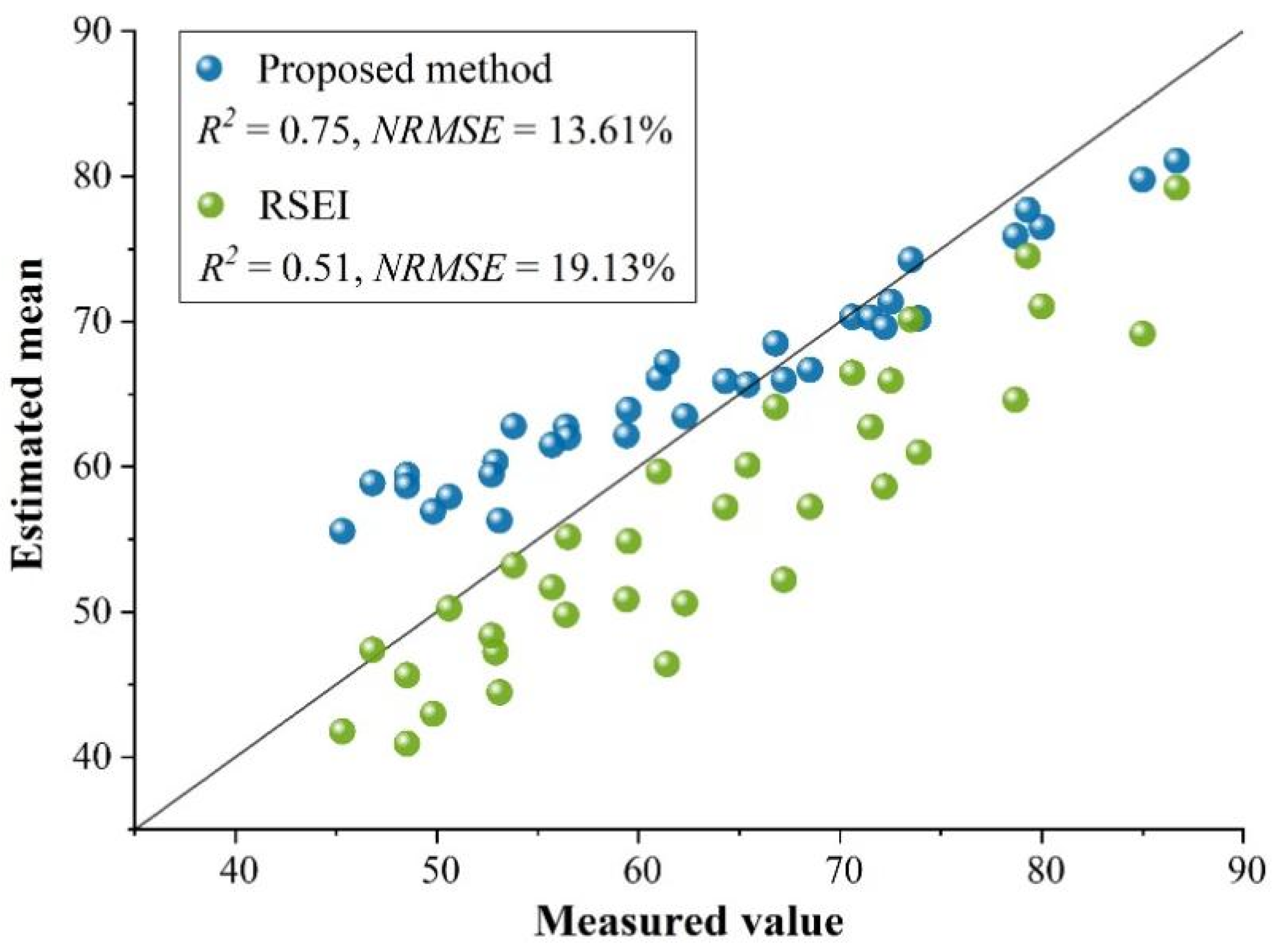 Third, this study focused on using RSIs in the PSR framework to quantify EEQ. We compared the proposed approach with the commonly used RSEI method to verify the accuracy and reliability of our approach for practical applications. We calculated RSEI in Guangzhou in 2013, 2016, and 2019. As shown in Figure 11, the EEQ spatial distributions obtained from the RSEI method and the proposed method are similar. However, the EEQ values are lower for the RSEI method than for the proposed method. A total of 34 samples (pink plots in Figure 2) were utilized to validate the estimated accuracies of EEQ for both methods. Figure 12 shows that the proposed method has a higher R2 (0.75) and a lower NRMSE (13.61%) than the RSEI method (R2 of 0.51 and NRMSE of 19.13%), suggesting that the proposed method is more reliable for evaluating EEQ. This study quantified EEQ directly using remote sensing techniques for the first time, which improved the accuracy and general applicability of EEQ evaluation using traditional remote sensing techniques.