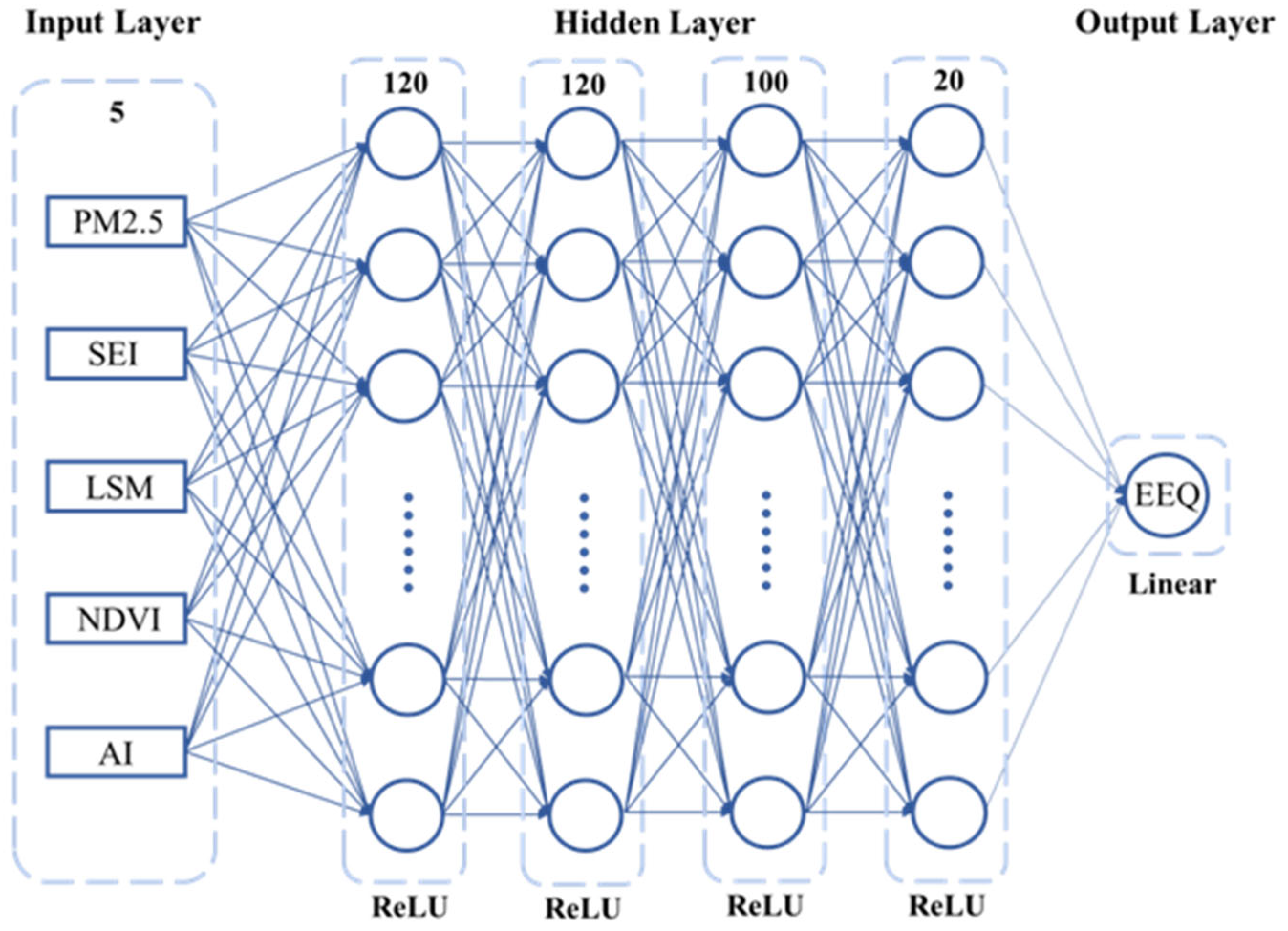 DNNs consist of an input layer, an output layer, and multiple hidden layers with many neurons and different weights between neurons [37]. The model uses the Adam optimizer, and the activation functions are the rectified linear unit (ReLU) function for the hidden layers and a linear function for the output layer, respectively [22]. In this study, the number of input neurons included five RSIs, and the output was the estimated EEQ. The structure of the DNN is shown in Figure 3.