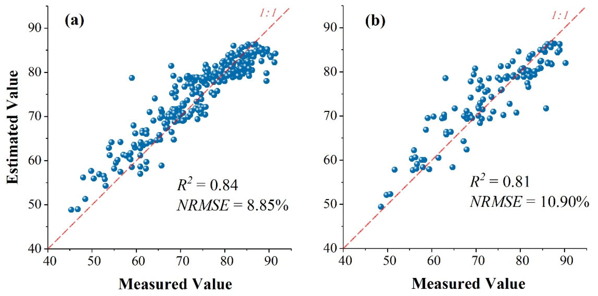 Moreover, 34 measured EEQ values in Guangzhou were used to validate the mapping accuracy of the DNN model (Figure 8). The result shows that the DNN provides good performance for estimating EEQ at the regional scale, with an R2 of 0.75 and an NRMSE of 13.61%.