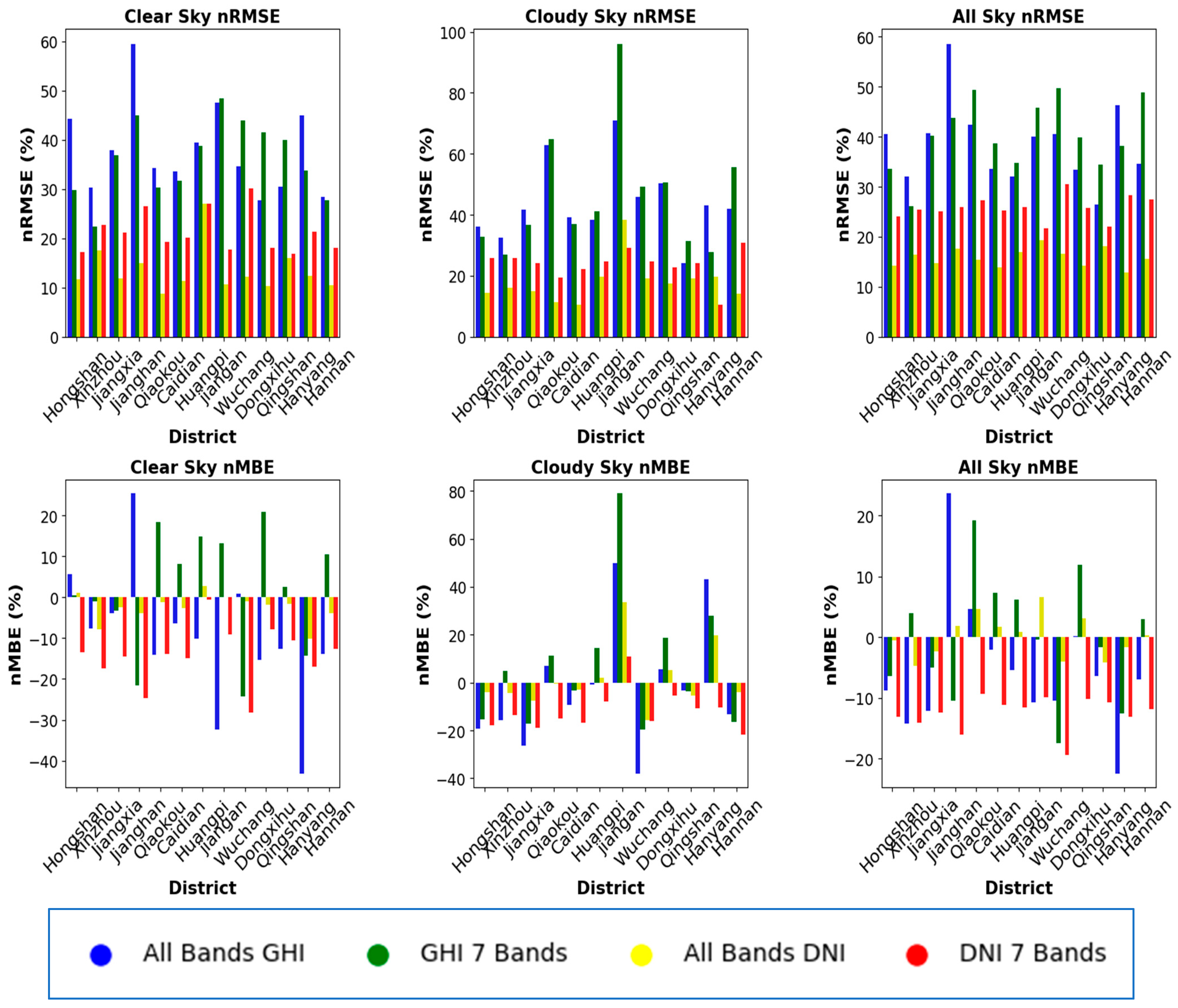 - Chen, S.; Li, C.; Xie, Y.; Li, M. Global and Direct Solar Irradiance Estimation Using Deep Learning and Selected Spectral Satellite Images. Appl. Energy 2023, 352, 121979. [Google Scholar] [CrossRef]