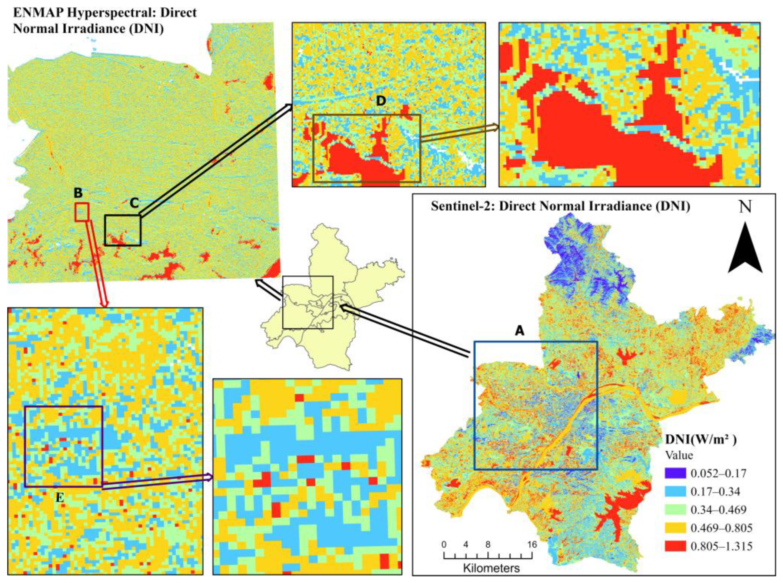 - Validation using hyperspectral imagery: Global Horizontal Irradiance (GHI) and Direct Normal Irradiance (DNI) maps produced by the model are compared with reference hyperspectral GHI maps derived from Sentinel-2 imagery to assess accuracy and reliability.
