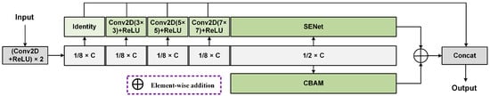 The processing flow of the module is as follows: First, standard small-kernel convolutions construct stable local feature representations. Parallel multi-scale convolutions then capture features at different receptive fields to complement scale variation information. Subsequently, channel and spatial attention mechanisms weight key channels and locations. The resulting features are finally fused and propagated to the subsequent stage. This design enhances the recognition of fine-scale objects (by preserving boundary integrity via small-scale convolutions), suppresses shadows and background interference (via attention mechanisms), and strengthens cross-region context modeling (via multi-scale feature fusion).