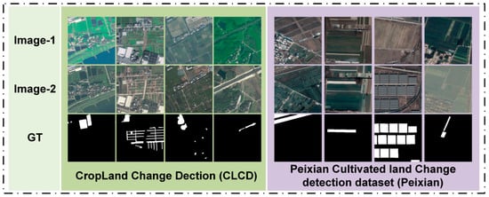 Figure 5. Examples from the CLCD and Peixian change detection datasets. (White regions indicate areas where changes have occurred, while black regions represent unchanged areas.)