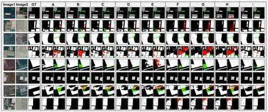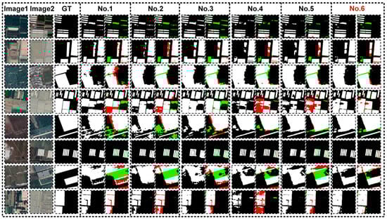 Figure 7. Ablation study results on the CLCD dataset (green areas indicate misclassified regions, and red areas indicate undetected regions. The brown text indicates the proposed model in this work).