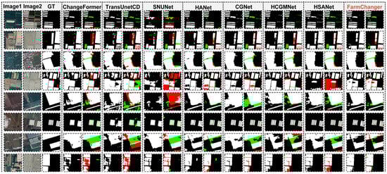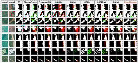 Figure 12. Comparison of change detection results on the Peixian dataset (green areas indicate false detections, red areas indicate missed detections. The brown text indicates the proposed model in this work).