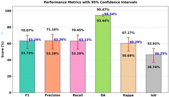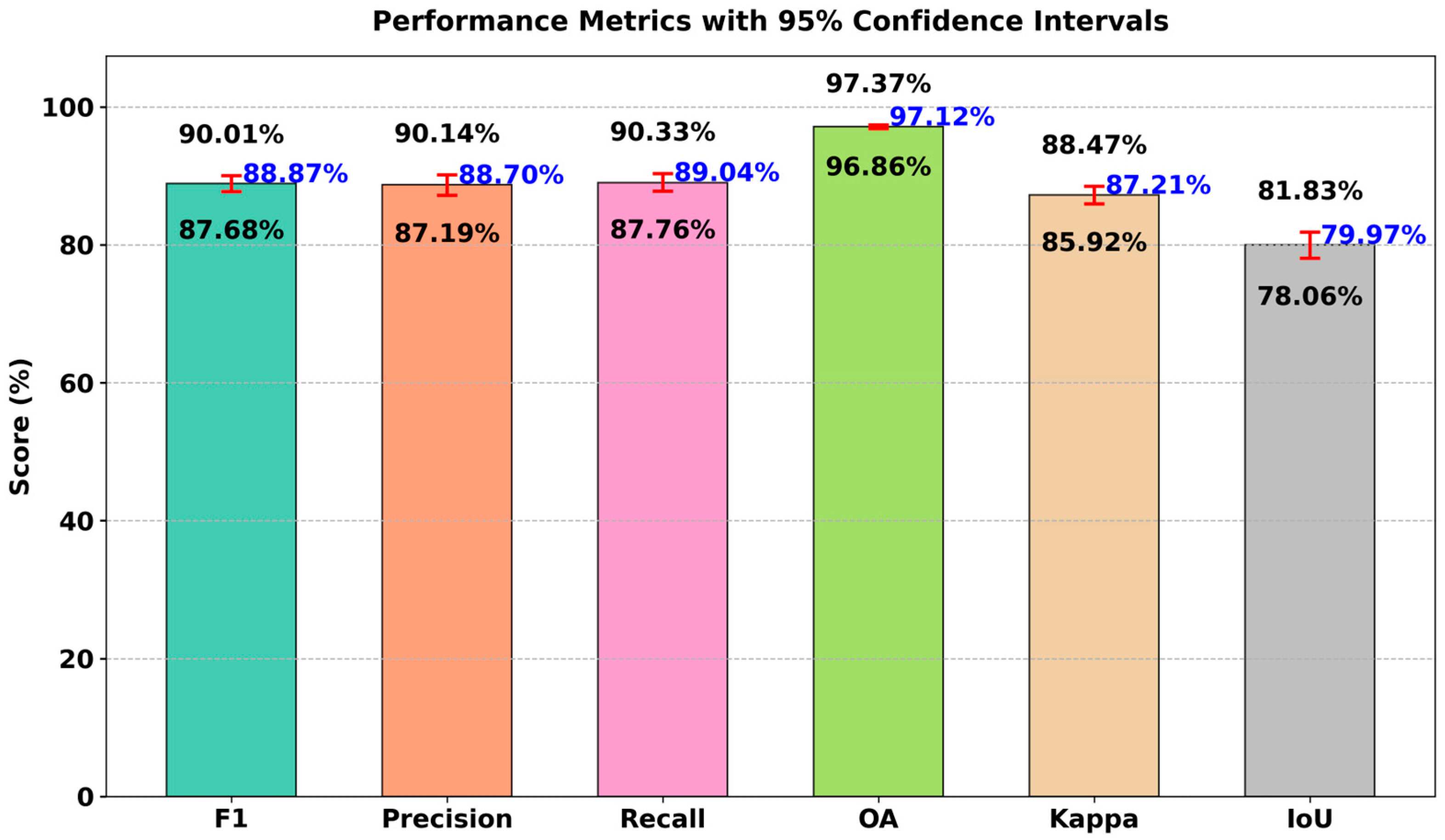 Figure 13. Confidence intervals of FarmChanger on the CLCD dataset (numbers in black indicate the upper and lower bounds of the confidence intervals).