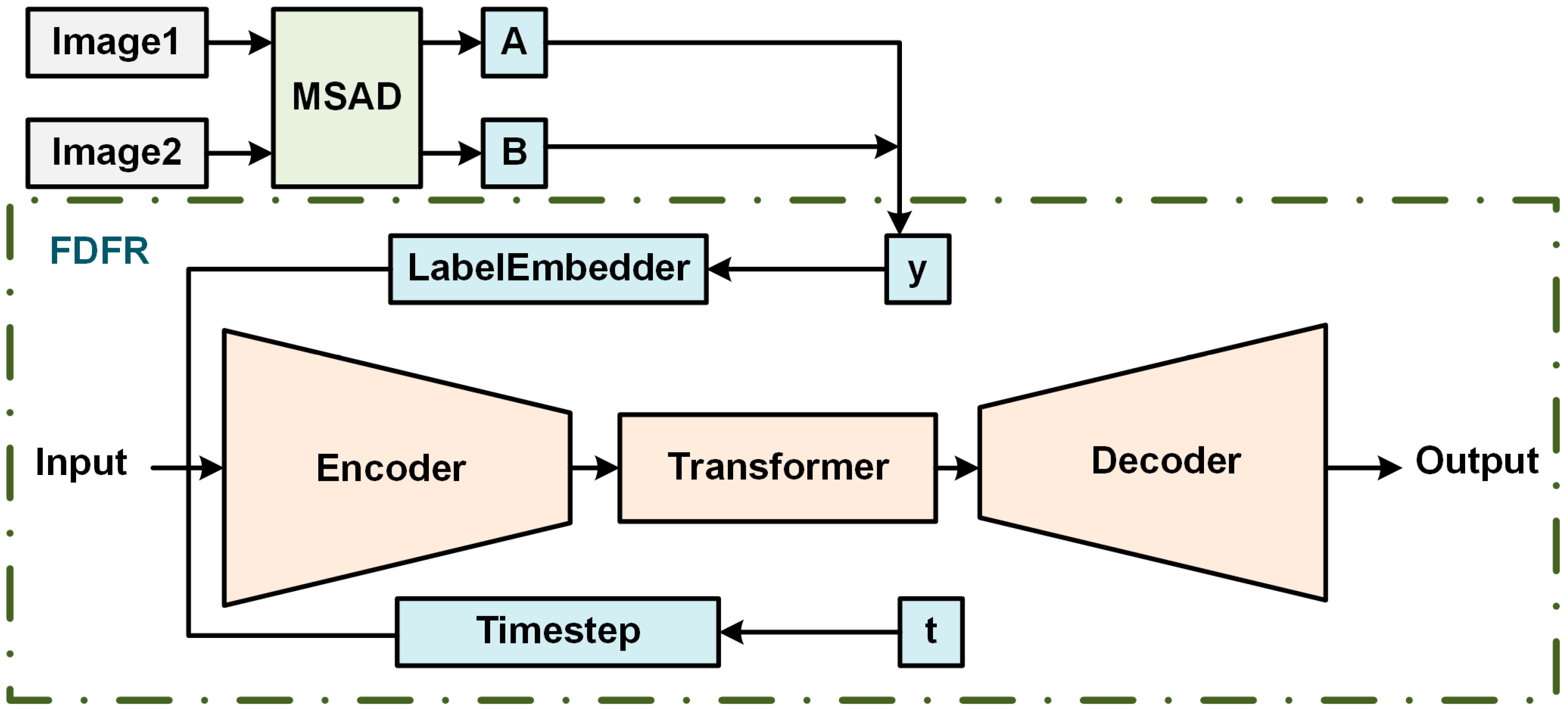 Unlike generative diffusion models, FDFR does not explicitly construct a noise-injection chain, perform noise alignment, or adopt score matching. The time step acts as a data-driven control variable rather than an iterative sampling index. The entire module is trained end-to-end under task supervision, producing refined features in a single forward pass.