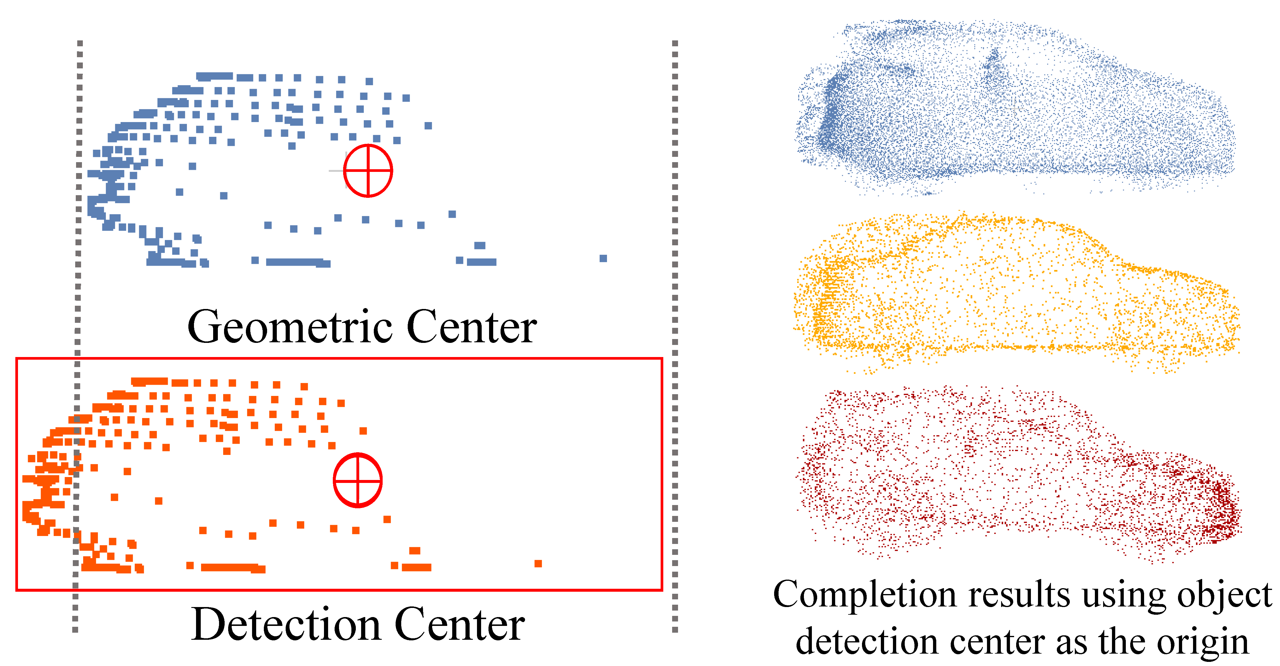 - We propose CFFCNet, a novel geometry-aware shape completion network explicitly designed to enhance vehicle localization and dimension estimation. By integrating center guidance into the completion process, our method effectively addresses the critical misalignment issue between detection centers and true geometric centers in real-world sparse point clouds.