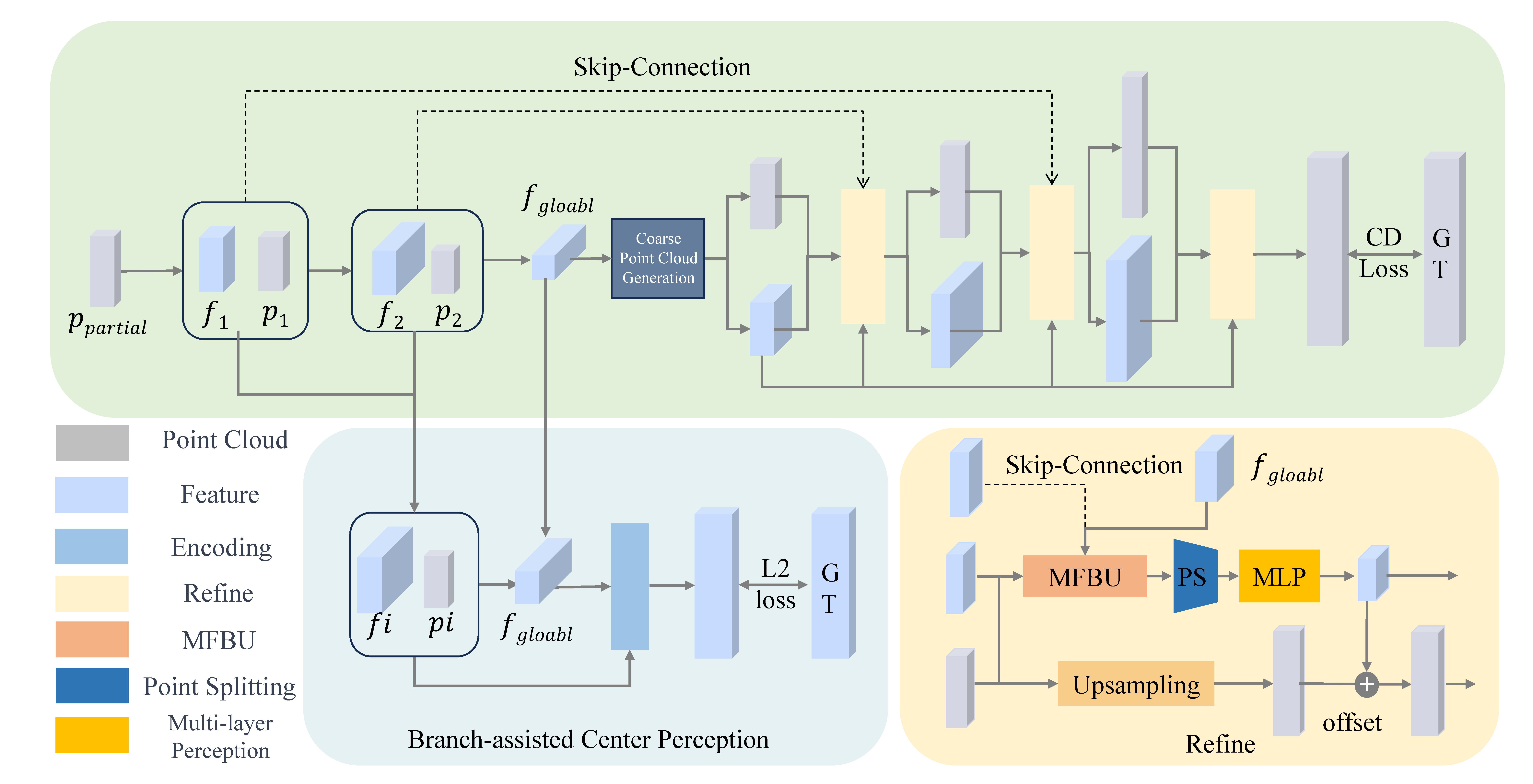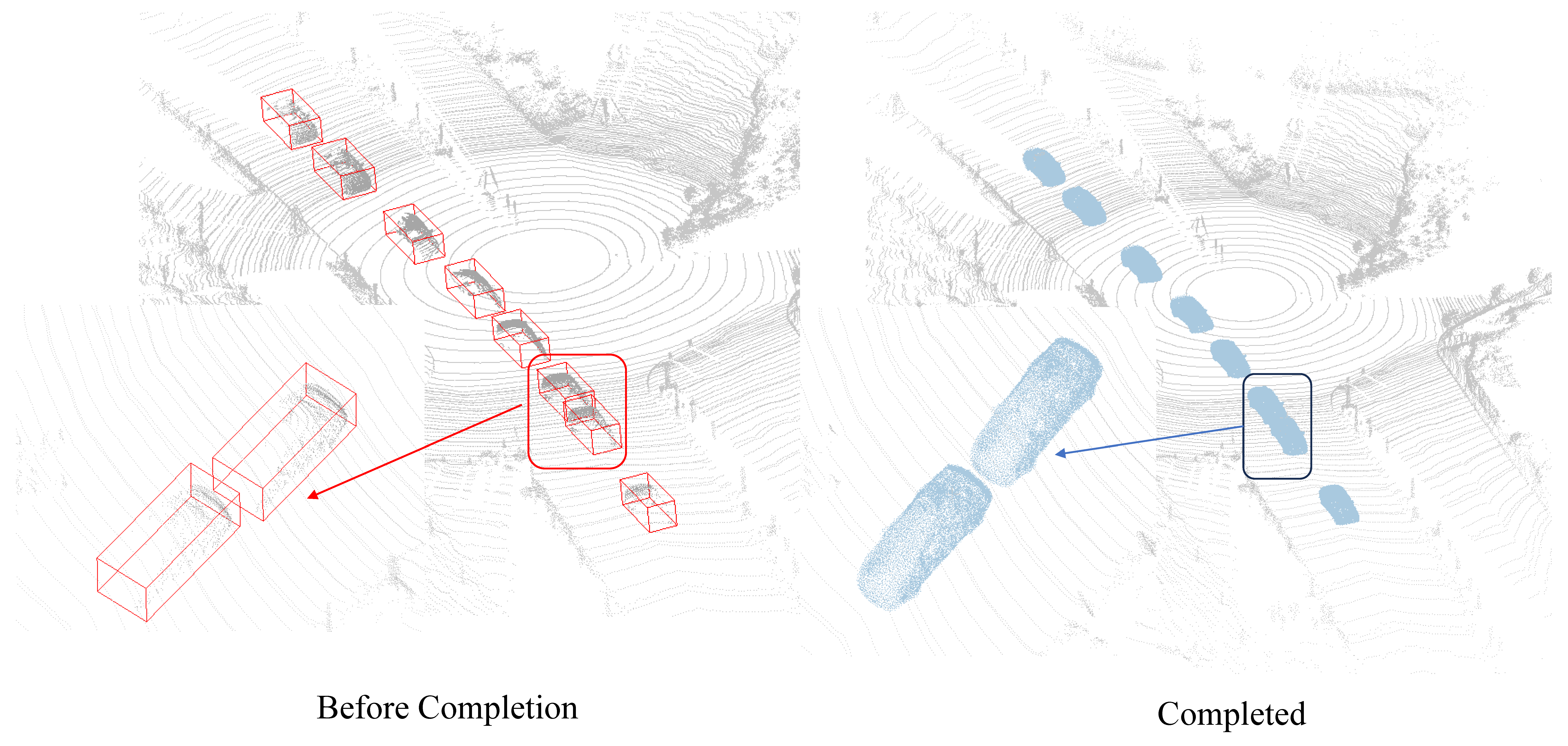 - We introduce a Branch-assisted Center Perception (BCP) module and a Multi-scale Feature Blending Upsampling (MFBU) module. The BCP module provides implicit supervision for accurate center and dimension prediction, while the MFBU module employs a cross-attention mechanism to fuse multi-level local and global features. This combination significantly improves the recovery of fine-grained geometric details and ensures high-fidelity completion.