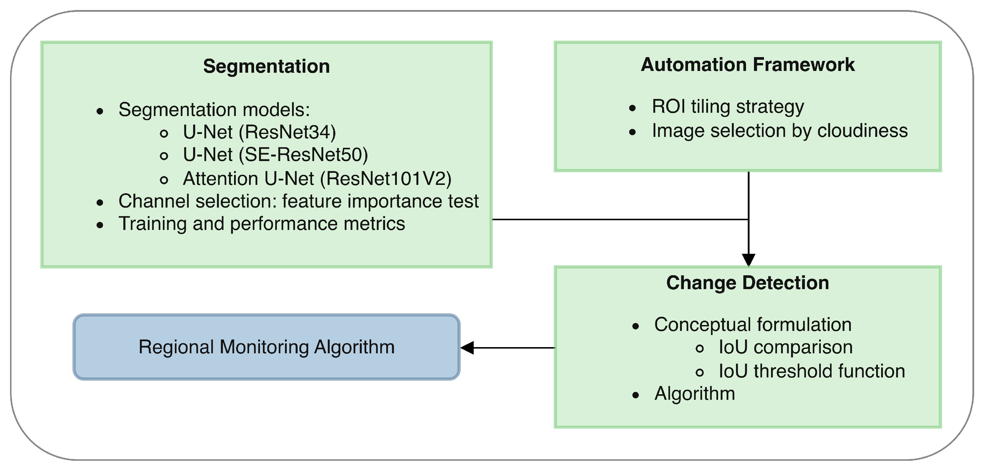 Change detection between two images was defined using the segmentation masks. Our proposed approach involves calculating the IoU of the two segmentation maps and determining if it falls below a certain threshold. The threshold is an increasing logarithmic function of land size, which allows more inconsistency in smaller islands. When IoU is lower than the threshold, the method verifies whether the change detection may be due to cloud presence. Change detection can also be done by downsampling the change mask to look for regions with a high density of changed pixels. The change detection method is applied to the monitoring of a region of interest of variable size. A tiling process is needed to obtain images of size . Once the tiling is defined, the region is analyzed by looping through the individual tiles and performing change detection on each one individually.