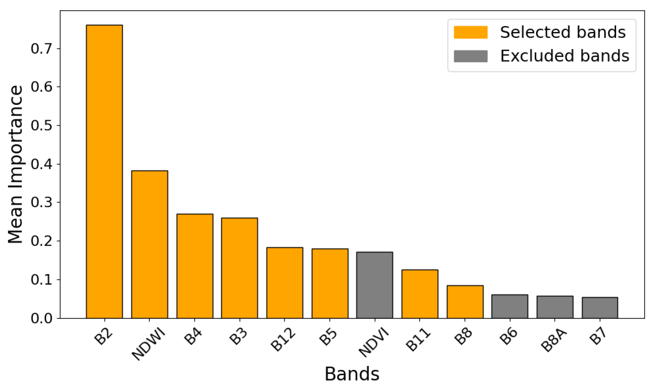 The resulting mean feature importance vector is used to guide the selection of a compact yet spectrally informative subset of Sentinel-2 bands. Specifically, we select all bands except B6, B7, B8A, and NDVI, for a total of 8 bands. This choice is made to retain the full core spectral range of Sentinel-2, while minimizing redundancy from adjacent or low-importance channels. B6, B7, and B8A are excluded due to their lower relative importance in the gradient-based analysis, whereas B5 and B8, which fall in the same VNIR spectral region, are retained. NDVI is excluded from the selected subset due to its limited relevance to the primary task of island segmentation. In contrast, NDWI, which emphasizes land–water boundaries, is retained due to its higher feature importance and direct relevance to distinguishing coastal and aquatic regions.