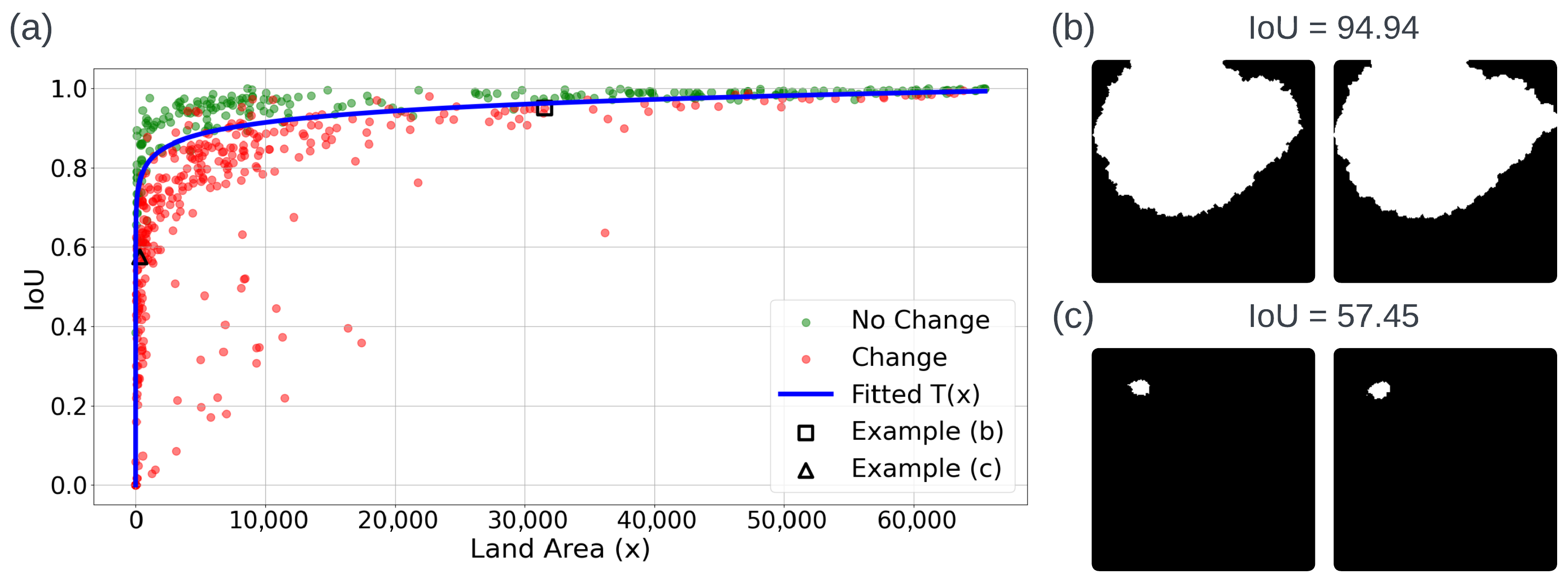 change. The algorithm segments both images using a trained segmentation model and calculates the IoU for class 1 (land) from the segmentation maps. The threshold for IoU is calculated via the logarithmic function defined above. The threshold is modeled as a function of the total land area in the first image, assuming the size of the image is exactly