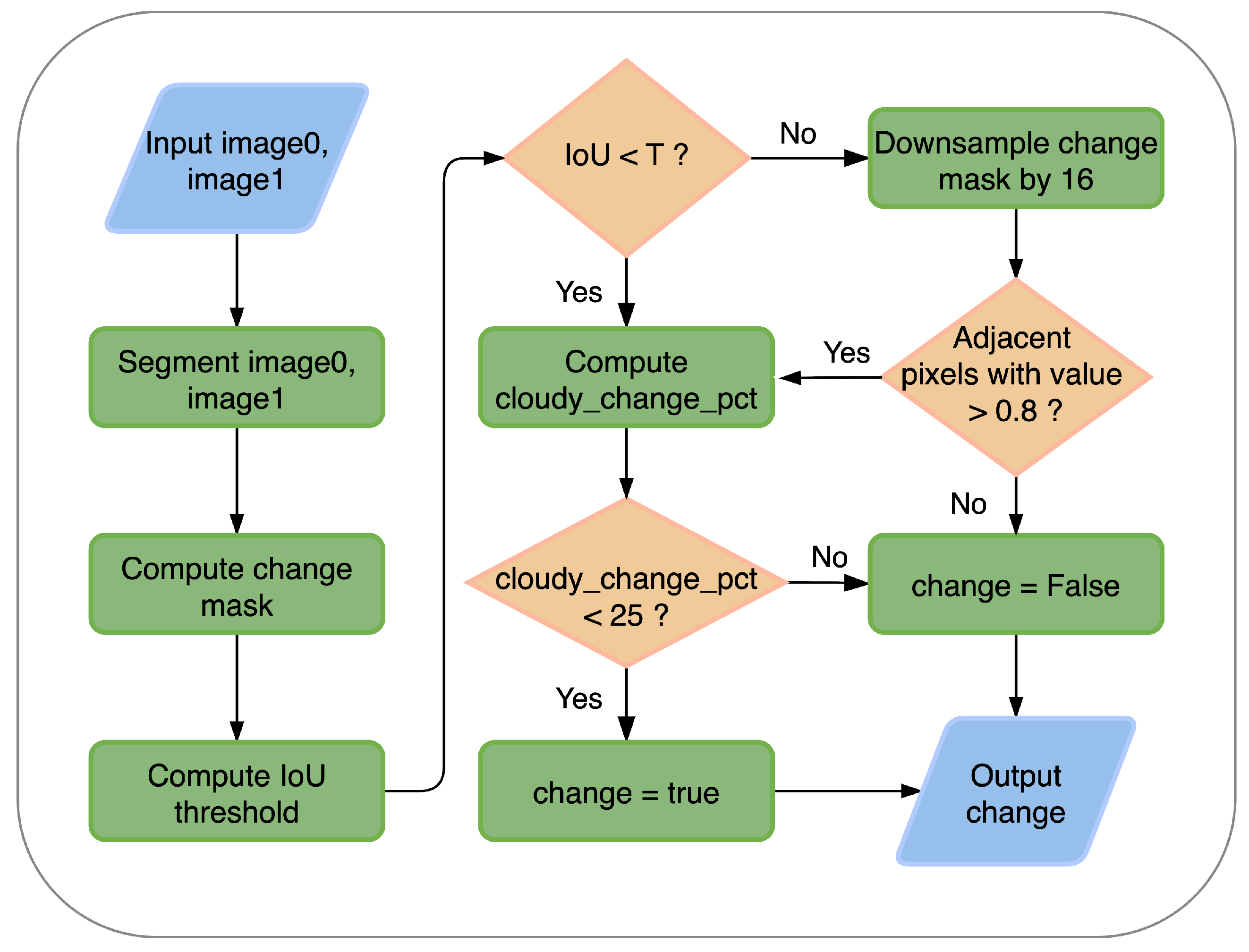 (a) if IoU is smaller than the threshold, a possible change is detected. To verify if this is due to cloud presence, we calculate the percentage of pixels with detected change that are cloudy in either image, using the CloudScore+ dataset. If this percentage exceeds 25%, the detected change is taken as dubious, i.e., a possible false positive due to cloud artifacts, and we conservatively set change to False. If the percentage is below 25%, we accept the IoU as indicating a change.