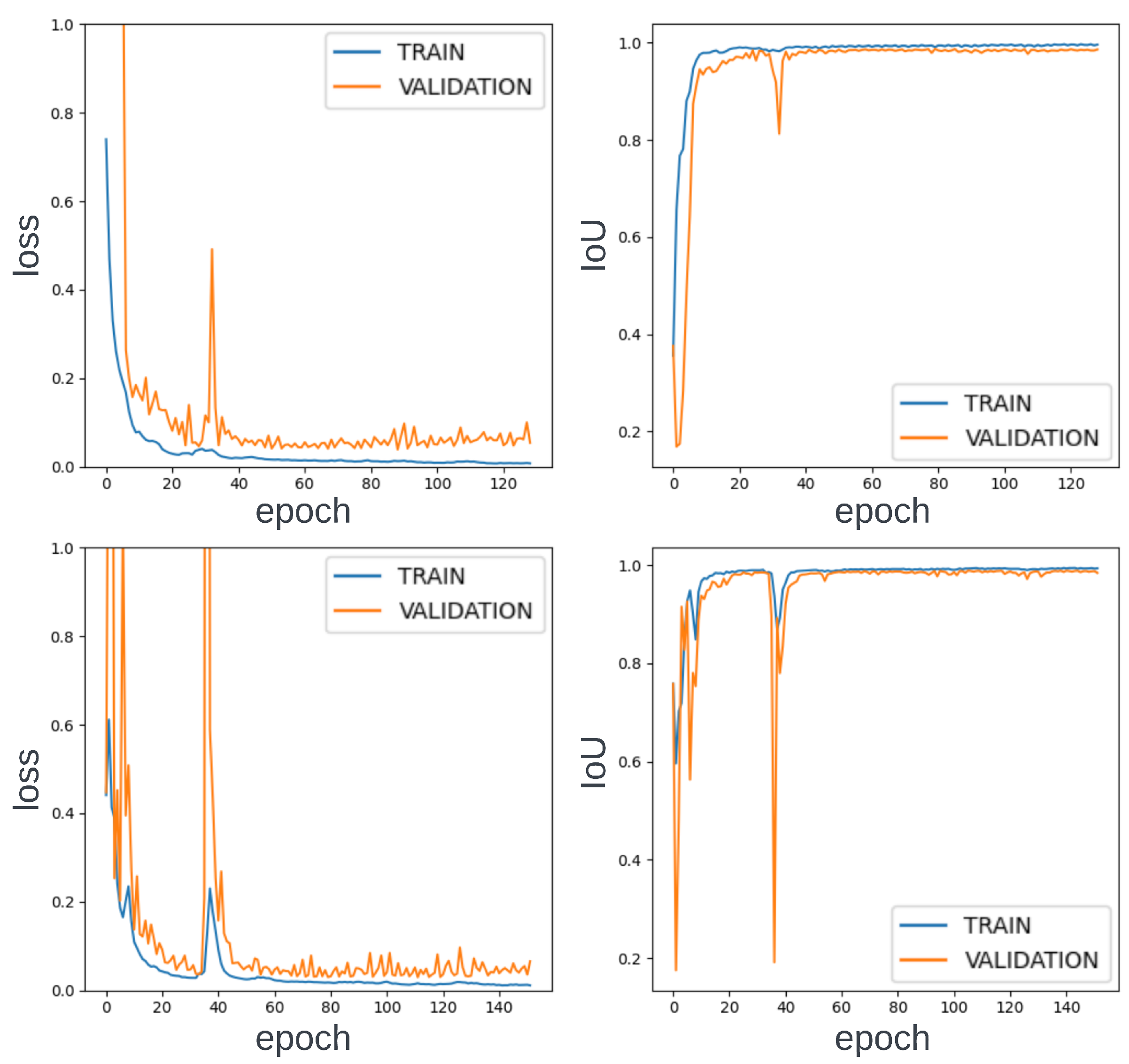 In order to evaluate the performance of the models under consideration, we adopt the following performance metrics: Precision, Recall, F1 score, Intersection-over-Union score (IoU), and Cohen’s kappa. Precision is the fraction of relevant instances among the retrieved instances, while Recall is the fraction of relevant instances that have been retrieved. Using True Positives (TPs), False Positives (FPs), and False Negatives (FNs), these are formulated as follows: