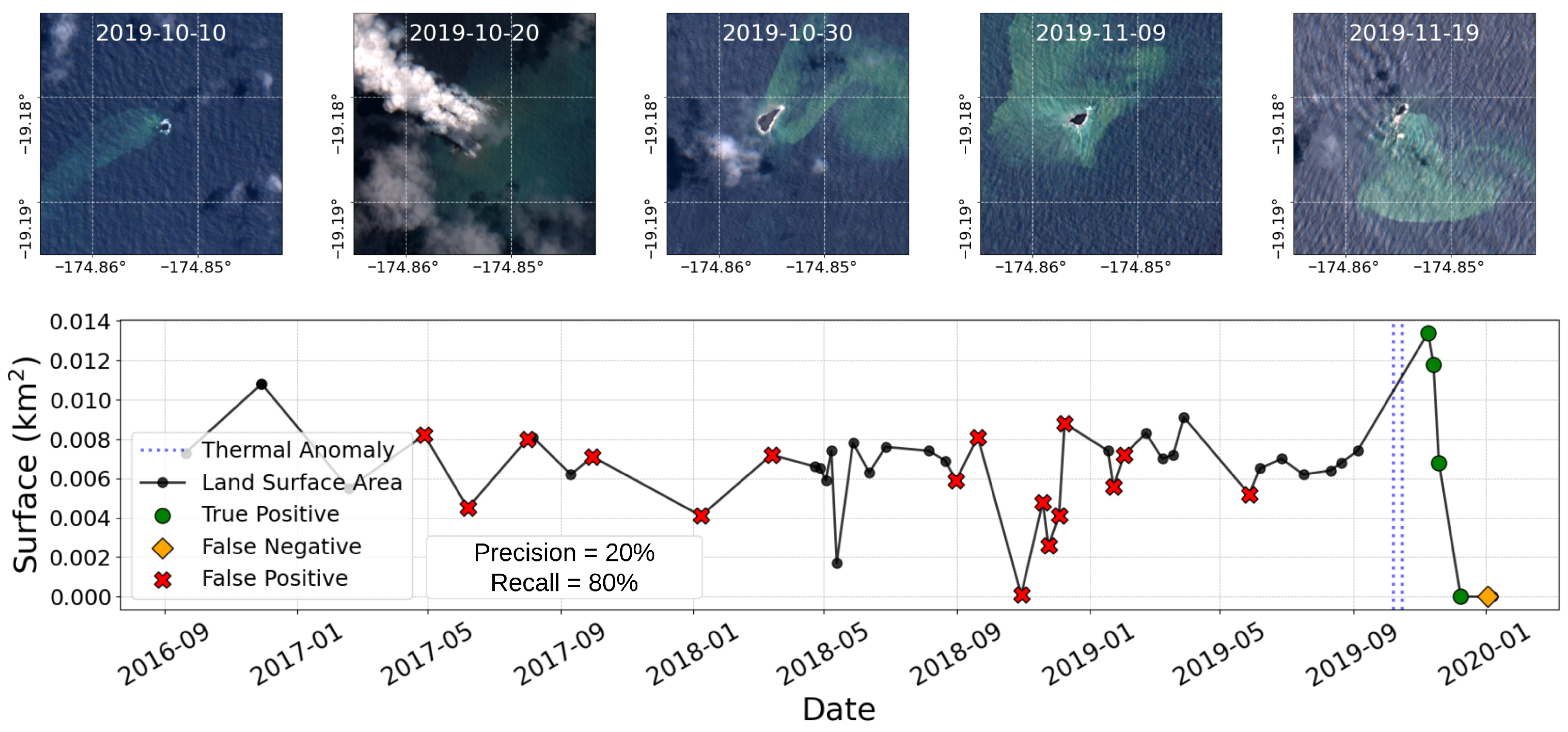 We applied the described procedure to known test cases of volcanic activity that caused changes in the shape of Metis Shoal and Home Reef islands. Although the methods were effective in identifying actual changes, their temporal resolution was at times limited by the availability of clear images. The use of MODIS thermal anomaly data can add context where data is missing, as the thermal infrared wavelengths used can penetrate some types of clouds. When using a higher cloudy pixel percentage threshold for image selection, we can obtain more data points at the cost of some noise. However, the verification step described in