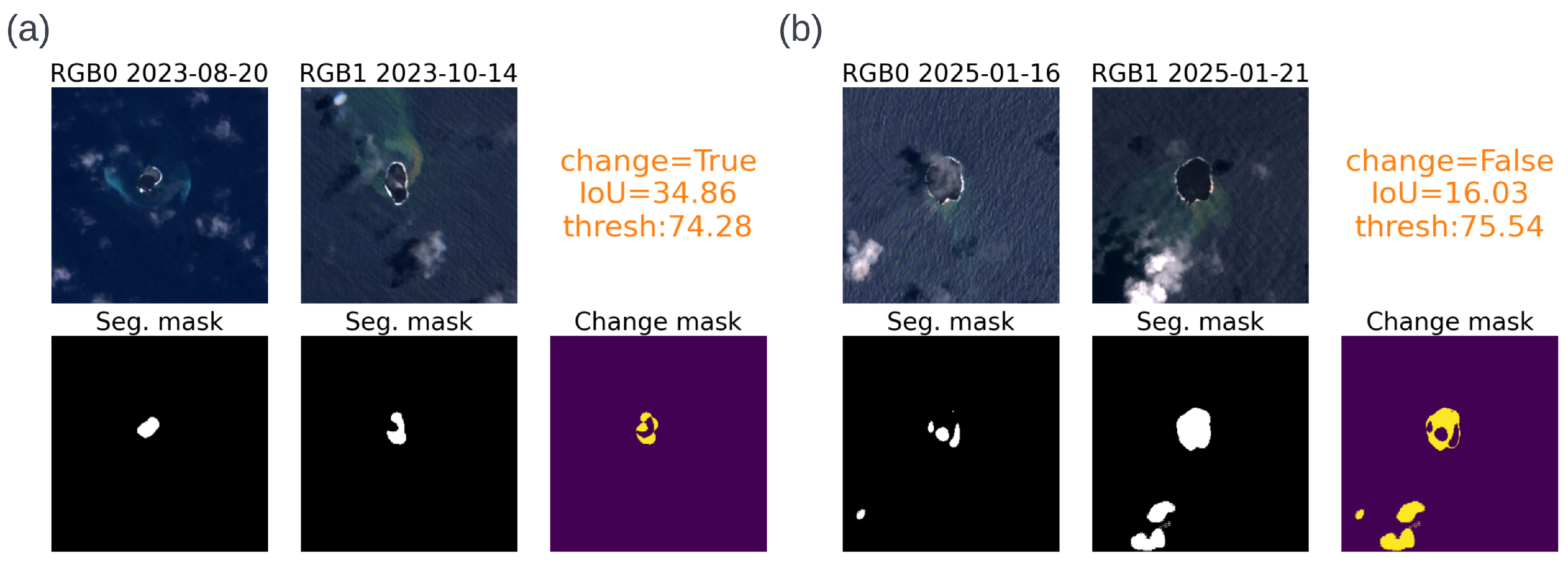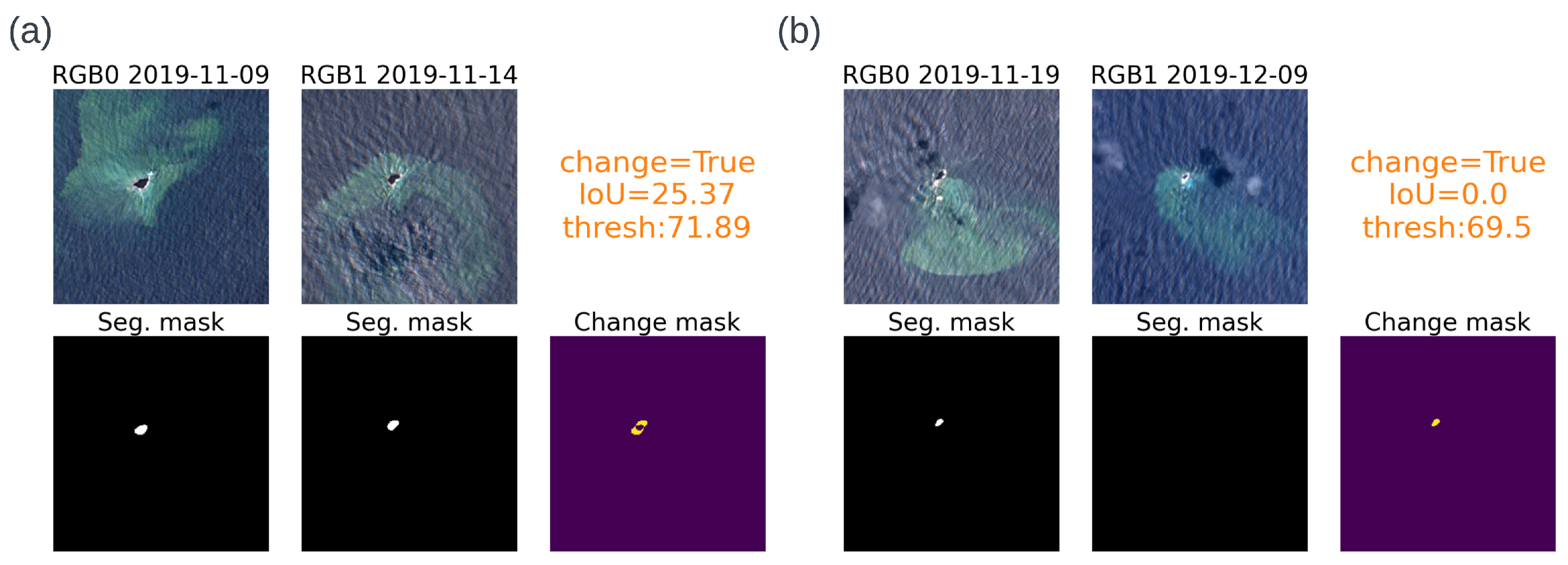 Section 4.3.2 often correctly detects cloud artifacts, preventing the detection of false changes. We analyzed time series for the two islands. In all cases, known events were successfully detected. However, some noise was present due to cloudiness and smoke from volcanic activity. Although the Precision of the change detection method was low (20.00% and 58.06% for the Metis Shoal and Home Reef series), a higher Recall (80.00% and 85.71%) is essential for the detection of dangerous cases; False Positives can be managed through manual follow-up assessments. While there is still a need for human verification in dubious cases (if not in all change classification cases), this task is not particularly cumbersome when the analyzed region is not extremely large. Out of 3055