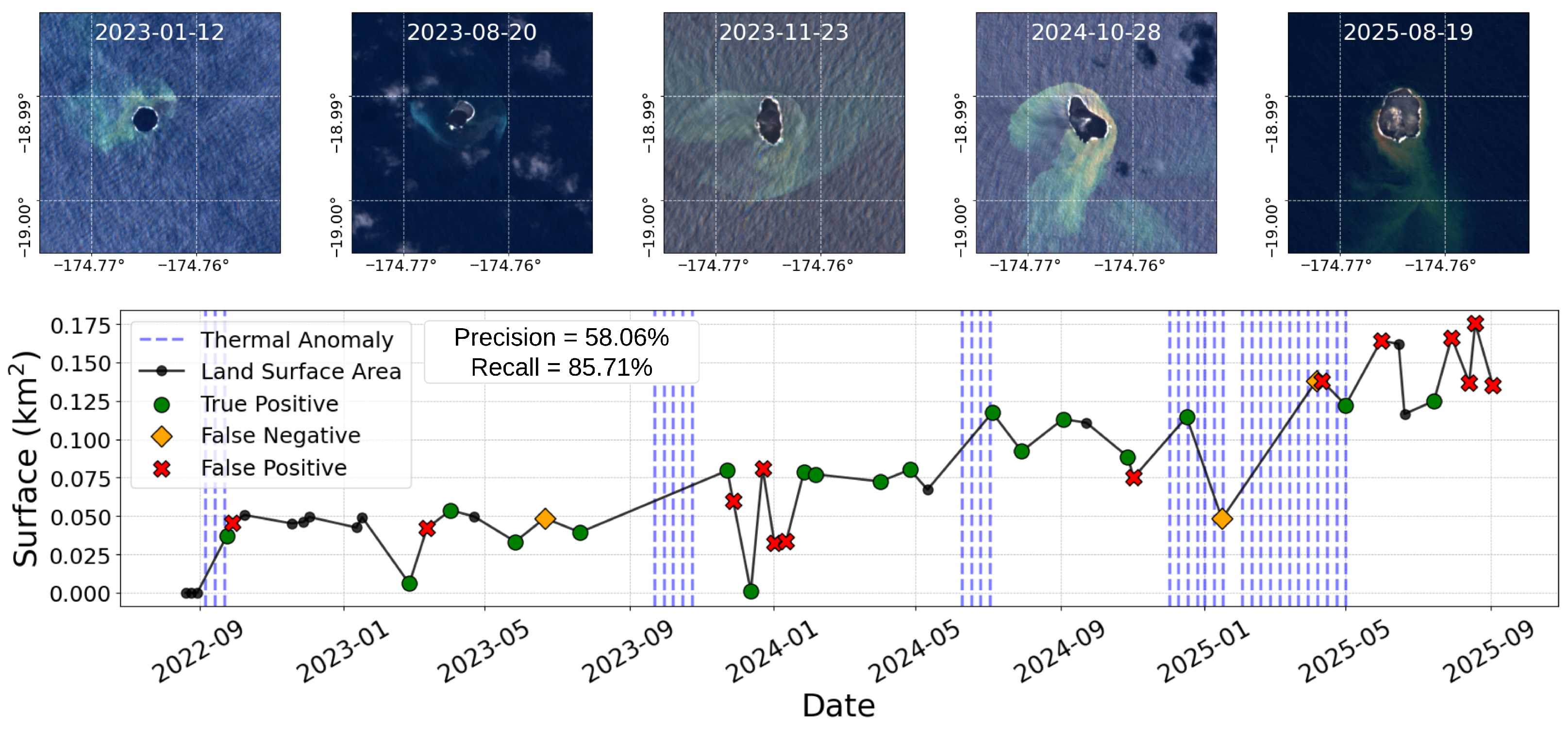 This application is timely, due to the ongoing intense activity at sites like Home Reef volcano. During the year 2024, Home Reef doubled in size, reaching a surface of around 165.9 m2 on 21 January 2025. The use of Sentinel-2 imagery, with a revisit time of 5 days, allows fast detection of volcanic unrest. This would provide valuable data for the issuing of hazard warnings for navigation safety.