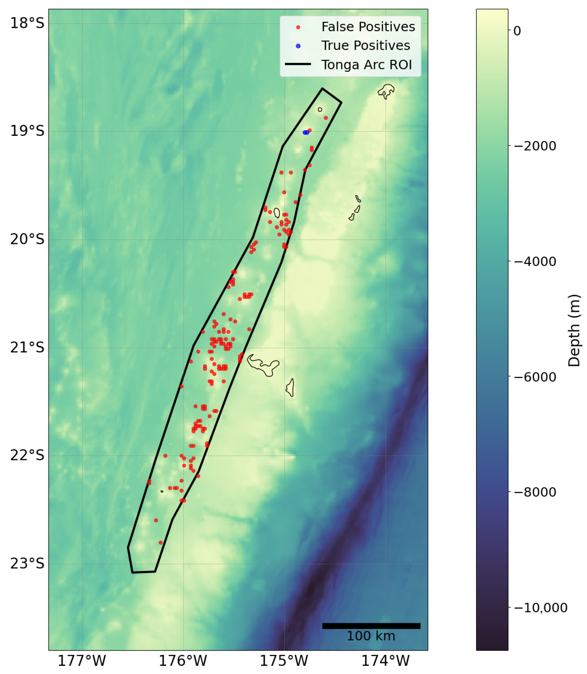 pixel tiles analyzed for the Tonga arc area, 153 were False Positives. Thus, we believe that the procedure can be successfully applied to the Tonga region, albeit in a semi-automatic fashion.