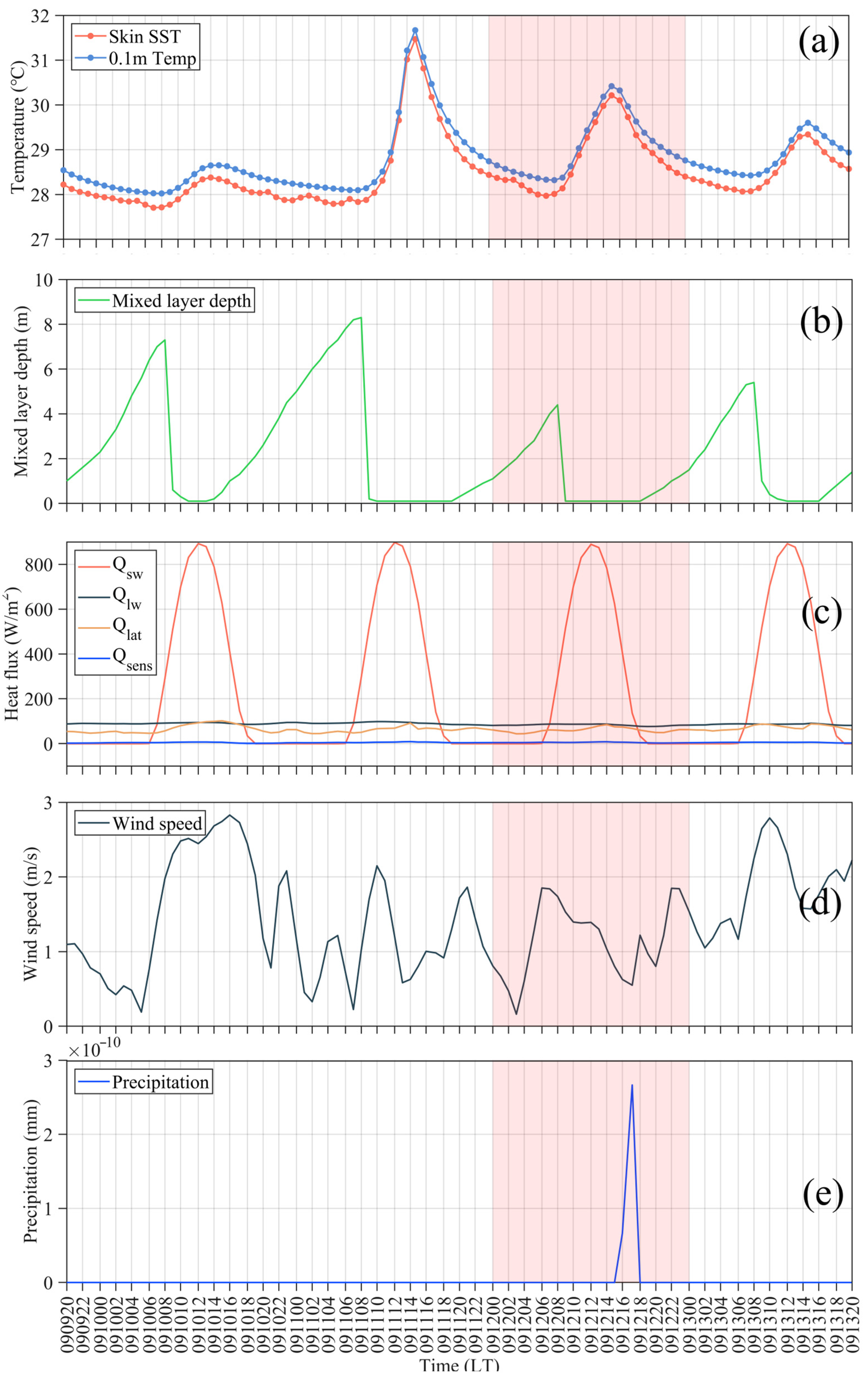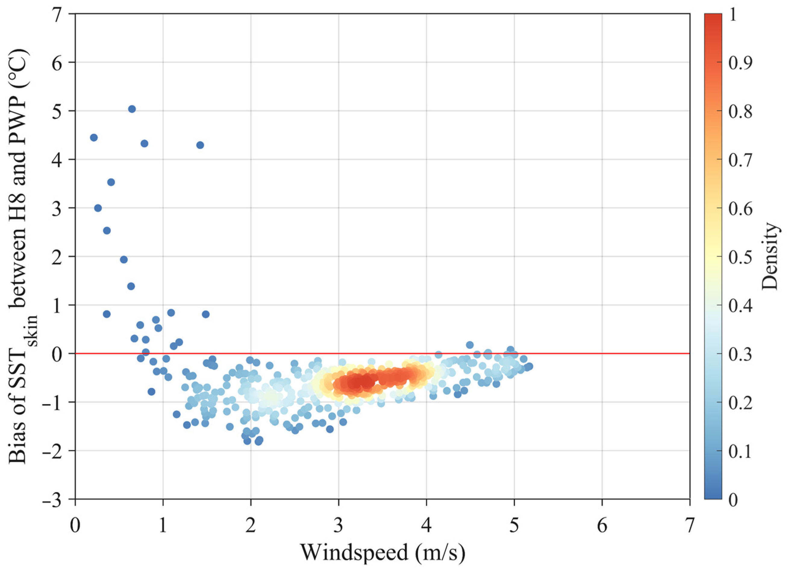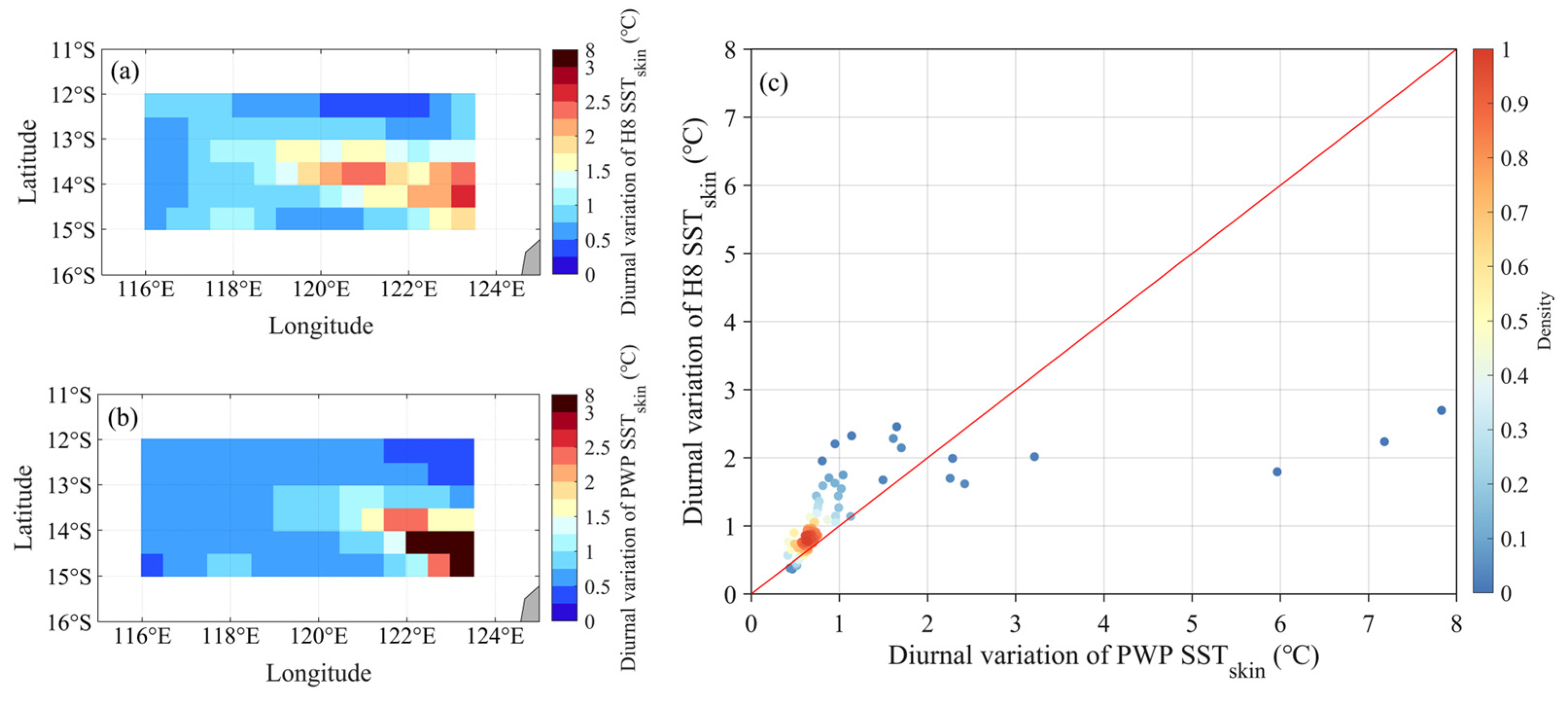 - The improved PWP model reproduced the SSTskin diurnal cycle consistently with observations of Himawari-8, matching significant warming regions and achieving a mean bias of −0.37 °C. Identified abnormal SSTskin overestimation in low-wind-speed areas when using the improved PWP model, which is attributed to rapid mixed-layer thinning and the lack of horizontal diffusion in this 1D model.