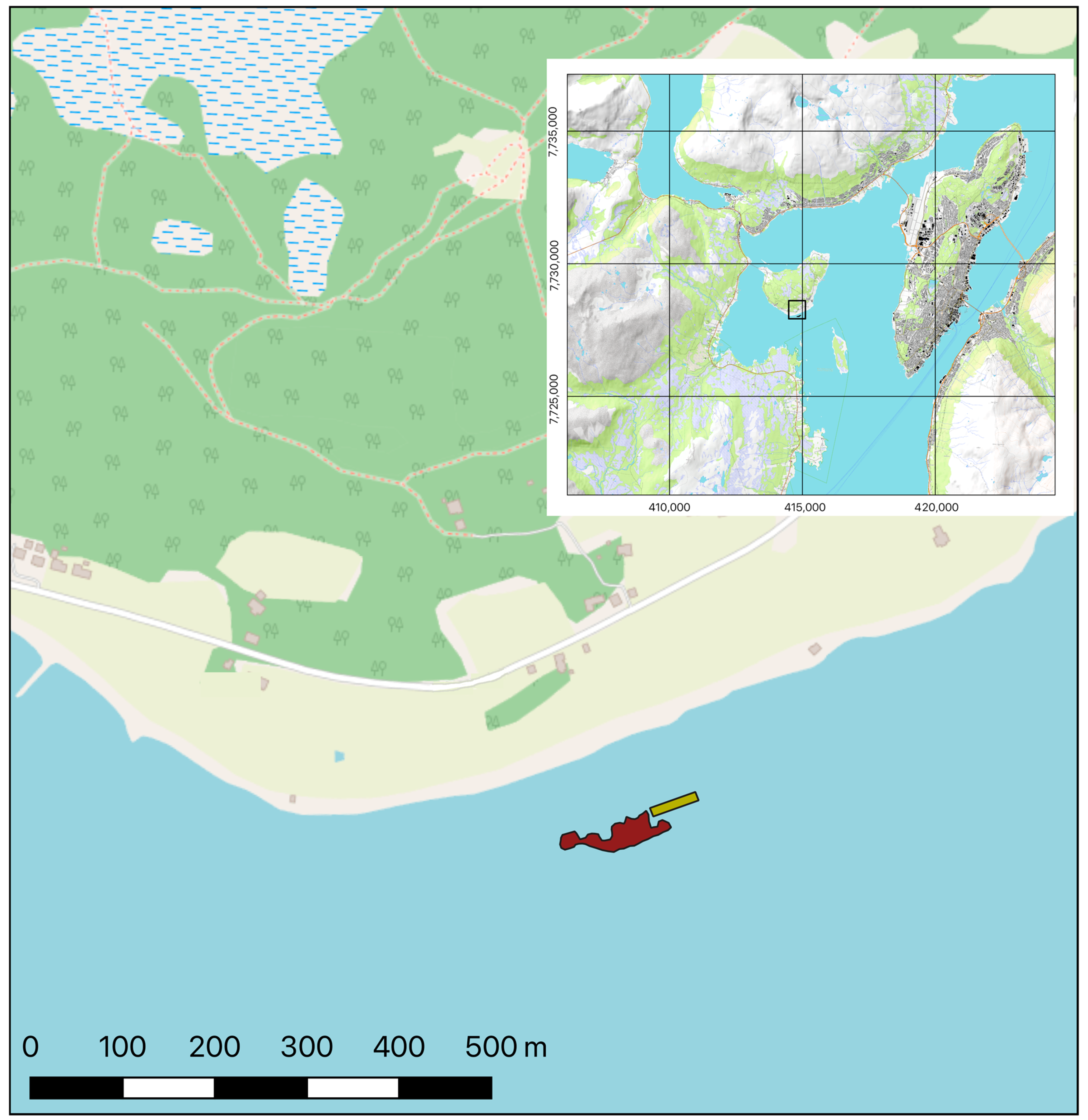 The study site is located off the southern shore of Håkøya Island in Troms County, Norway, at approximately 69.647°N, 18.806°E (