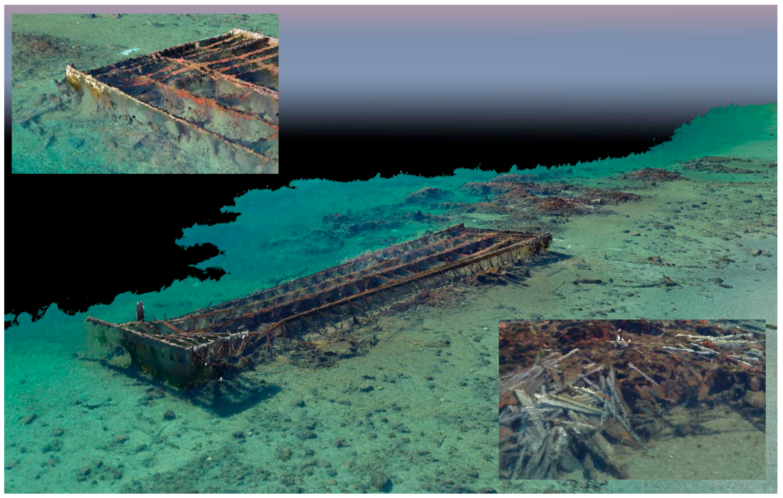 The principal aim of this study was to investigate whether UAV-based SfM and multispectral imaging are capable of providing better-than-decimetric-resolution reconstructions of submerged structures in shallow water. Despite the challenges posed by refraction, the results were positive and strongly suggest that this approach is viable for documenting and monitoring submerged heritage. Since the existing literature in this area is not extensive, this is a significant finding, especially to the extent that it shows that off-the-shelf hardware and software can be adequate to the task.