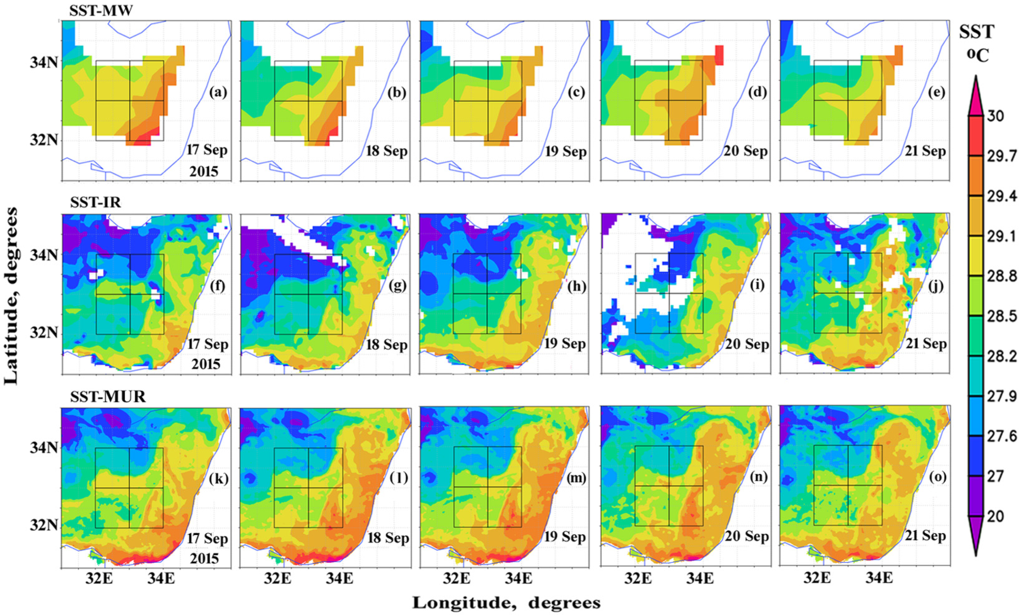 - JPL MUR MEaSUREs Project, JPL NASA. GHRSST Level 4 MUR Global Foundation Sea Surface Temperature Analysis (v4.1); JPL MUR MEaSUREs Project: Pasadena, CA, USA, 2015. [CrossRef]