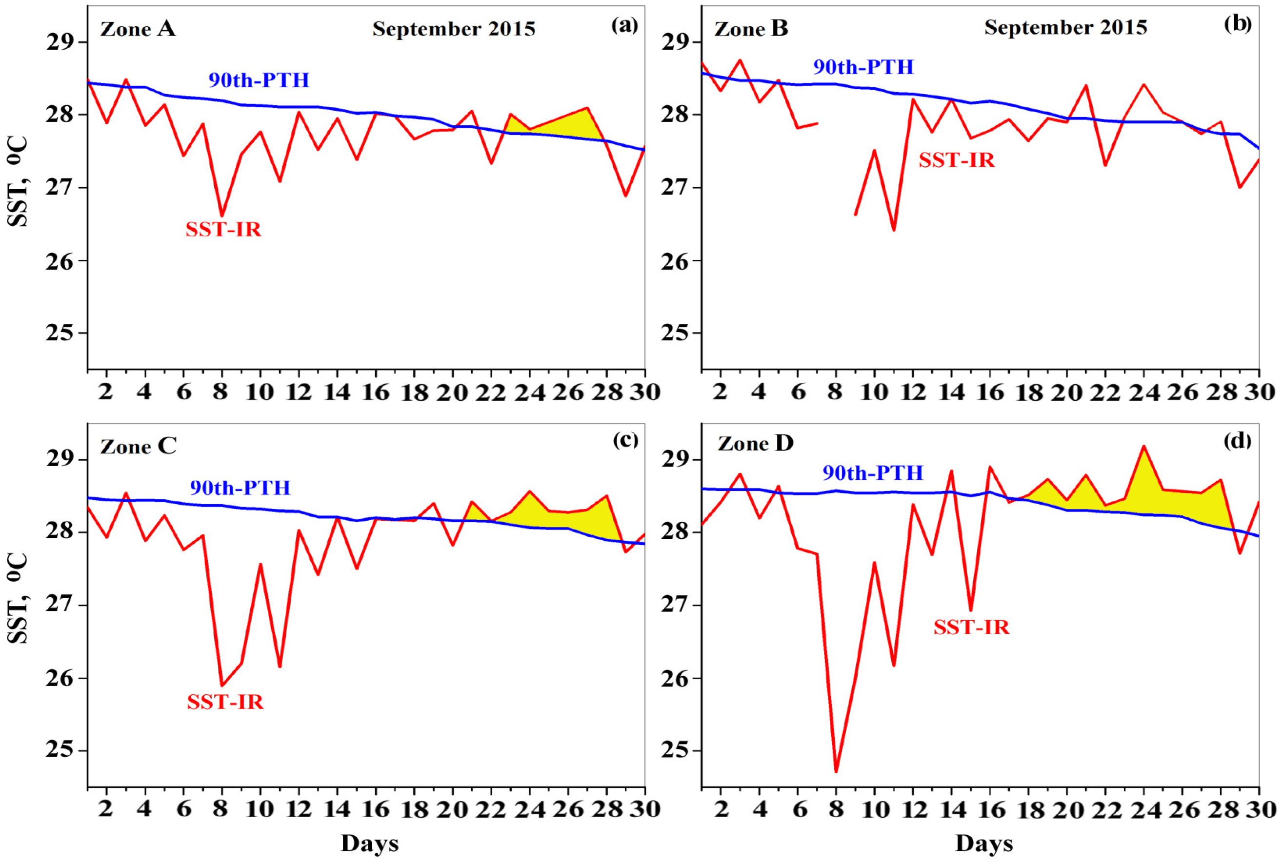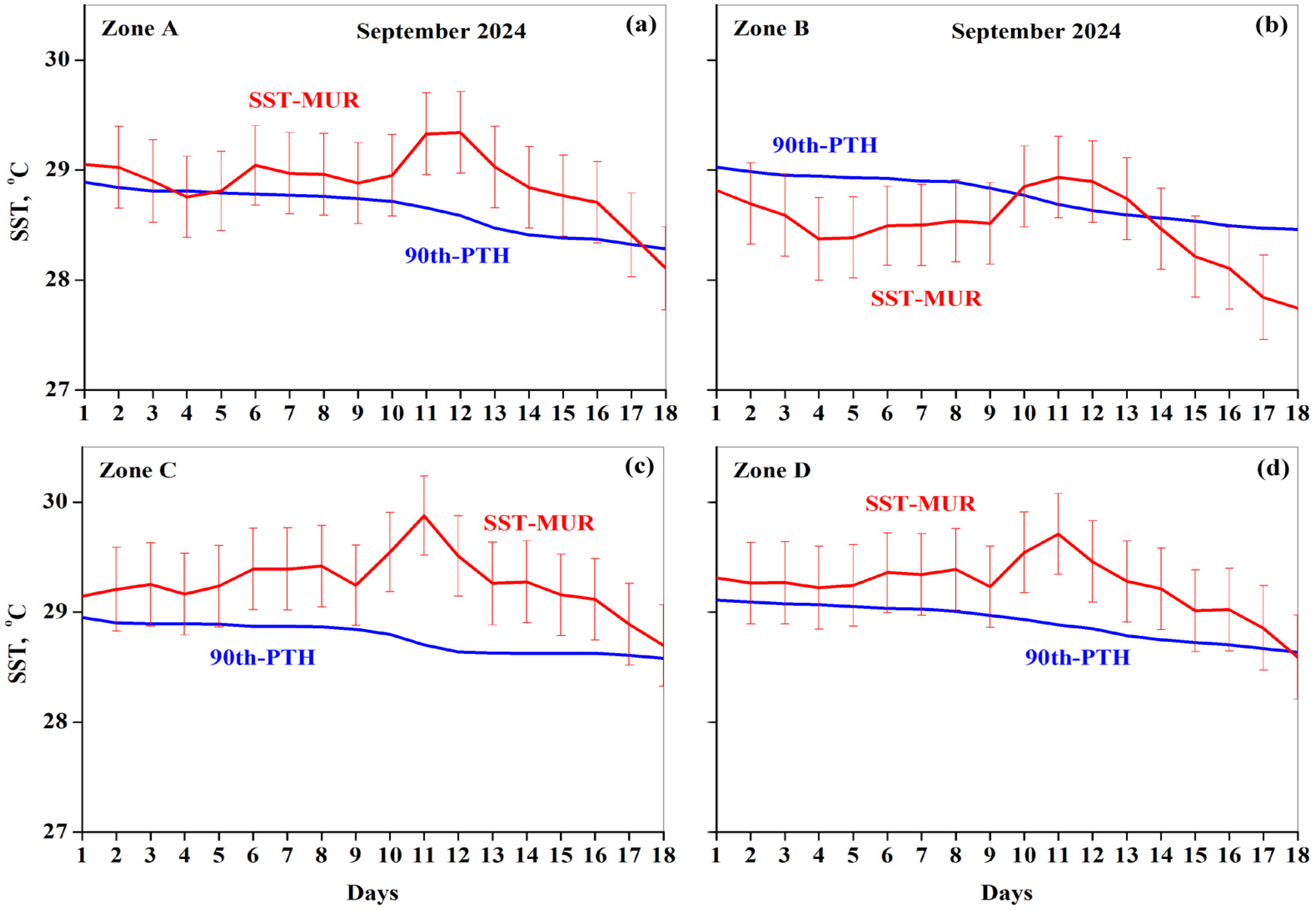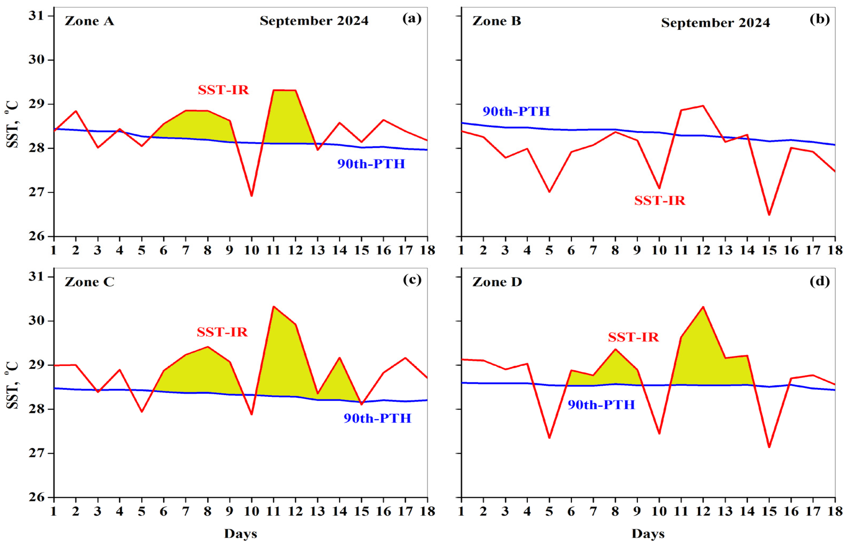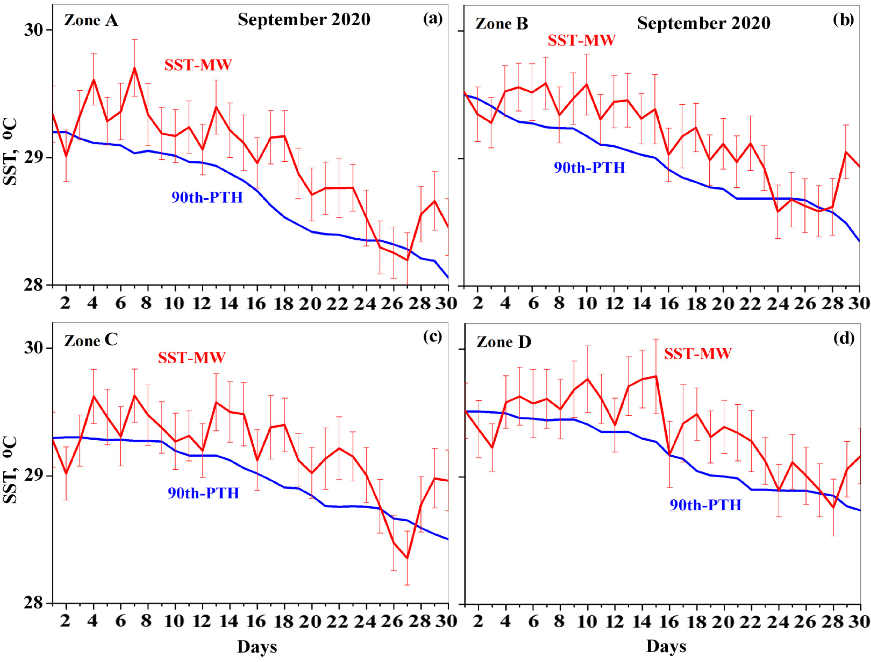 - The incapability of satellite infrared radiometry to detect MHWs in the presence of desert dust intrusion substantially reduces the capability of detecting MHWs by the datasets which integrate microwave and infrared radiometry of sea surface temperature. This leads to an underestimation of the presence of MHWs as an essential indicator of regional warming in the Eastern Mediterranean.