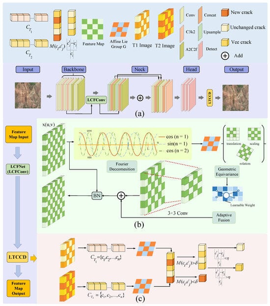 Overall architecture of the proposed UAV-based crack detection and temporal change analysis framework. (a) The pipeline integrates UAV image acquisition, backbone–neck–head detection, and temporal reasoning, enabling joint spatial–temporal crack interpretation. The backbone is equipped with the proposed Longitudinal Crack Fitting Convolution (LCFConv), which embeds affine Lie group operators to enhance geometric adaptability for elongated and irregular crack patterns. (b) The detailed design of LCFConv: feature maps are decomposed in the Fourier domain to capture local oscillation modes, followed by adaptive fusion guided by learnable weights to maintain geometric equivariance under translation, rotation, and scaling. (c) The Lie-group-based Temporal Crack Change Detection (LTCCD) module compares bi-temporal feature tensors and , measures their manifold distances in the Lie group space, and identifies new, unchanged, and V-shaped extended cracks through adaptive matching. Together, LCFNet and LTCCD form a unified, interpretable pipeline that jointly performs crack detection and temporal evolution analysis from UAV imagery.