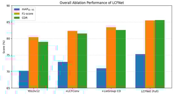 In comparison, our proposed LCFNet, built upon the YOLOv12 backbone (CSPDarknet-P6), achieves the highest performance across both detection and change detection metrics. LCFNet improves mAP50:95 by more than 5% over YOLOv12 and significantly surpasses all baselines, including crack-specific methods, in CDR and CEA, demonstrating its strong capability for UAV-based crack monitoring and temporal evolution analysis.