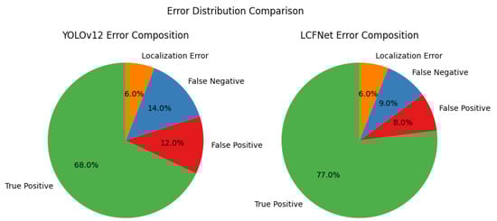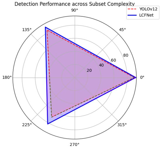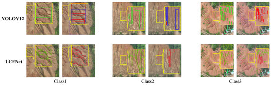 As illustrated in Figure 12, compared with the baseline YOLOv12, the proposed LCFNet shows clear superiority across three representative UAV crack detection scenarios. In Class 1, where cracks are wide and irregular, YOLOv12 tends to produce fragmented bounding boxes and blurred boundaries due to limited geometric adaptability, while LCFNet achieves smoother contour fitting and more accurate morphological alignment through its longitudinal crack fitting mechanism. In Class 2, where cracks extend continuously along the mountain slope, YOLOv12 often suffers from structural discontinuity and background interference, whereas LCFNet maintains coherent detection by preserving the continuity of elongated fractures and effectively distinguishing cracks from soil textures. In Class 3, which contains numerous small and discontinuous cracks, LCFNet captures finer crack segments with higher sensitivity and better completeness, overcoming the under-detection issue of YOLOv12. Overall, these results demonstrate that LCFNet can adaptively fit the elongated morphology of cracks under diverse terrain conditions, ensuring higher precision and continuity in UAV-based crack inspection.