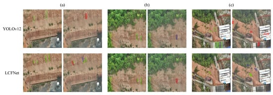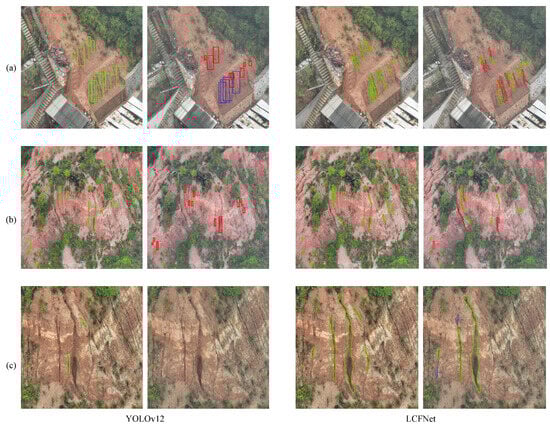 Qualitative comparison between YOLOv12 and the proposed LCFNet on three representative UAV-based crack inspection scenarios. (a) Class 1: YOLOv12 tends to produce fragmented rectangular boxes and incomplete boundaries, while LCFNet precisely fits the elongated morphology through irregular rectangular fitting and continuous edge delineation. (b) Class 2: in this complex terrain, YOLOv12 often fails to capture the full continuity of cracks along the slope, whereas LCFNet maintains structural coherence and avoids over-segmentation by leveraging the Longitudinal Crack Fitting Convolution (LCFConv). (c) Class 3: LCFNet demonstrates superior detection sensitivity for multiple small-scale fractures, achieving denser and more consistent localization than YOLOv12.
