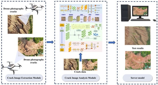 To support robust crack detection and temporal evolution analysis, this study establishes a complete UAV-based imaging, preprocessing, and dataset preparation pipeline. A DJI UAV platform equipped with the Zenmuse L2 LiDAR–RGB integrated system was used to acquire high-resolution aerial imagery, achieving sub-centimeter ground sampling distance at typical flight altitudes. We provide explicit flight-project information: four acquisition sites (S1–S4) located around Longfengshan, Longfuxin Village, Ningxiang City, Hunan Province, with flight altitudes ranging from 30 to 45 m and resulting GSD values between 1.1 and 1.6 cm/pixel (see Table 1). Each site includes 820–1240 images captured under controlled illumination conditions. During data collection, the UAV followed pre-planned serpentine or grid-based trajectories with forward/side overlap ratios matching the site-specific settings reported in Table 1 (70–85% forward and 60–70% lateral overlap). These overlap parameters ensure geometric continuity and stable correspondence across repeated acquisitions while maintaining sufficient redundancy for temporal crack evolution analysis. Camera parameters were maintained consistently across flights, and imaging was conducted under stable illumination to minimize shadows, vegetation motion, and radiometric fluctuation, thereby ensuring cross-session comparability and robust downstream crack interpretation.