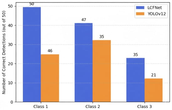 Comparison of detection results between LCFNet and the baseline YOLOv12 across three crack categories, each containing 50 UAV images. The vertical axis indicates the number of correctly detected samples (out of 50). LCFNet detects nearly all samples in Class 1 and maintains high accuracy in Class 2 and Class 3, where YOLOv12 suffers from severe omissions. The significant improvement on Class 3 demonstrates that LCFNet effectively captures slender and discontinuous crack structures under challenging UAV imaging conditions.