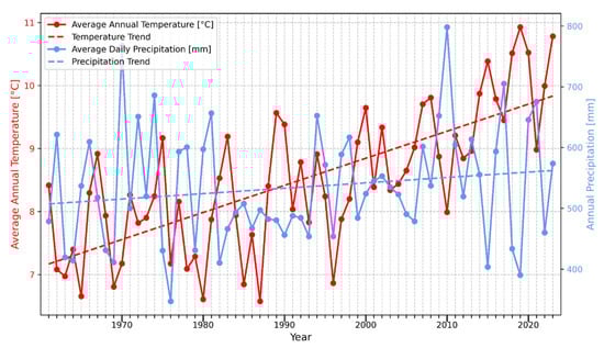 To confirm the general trends in climate variability, an analysis was conducted of changes in total annual precipitation (Figure 1), precipitation intensity (Figure 2), and mean annual temperature (Figure 1 and Figure 2) for the period 1961–2023. Both graphs were prepared using open data provided by the Institute of Meteorology and Water Management—National Research Institute (IMGW-PIB) [46].